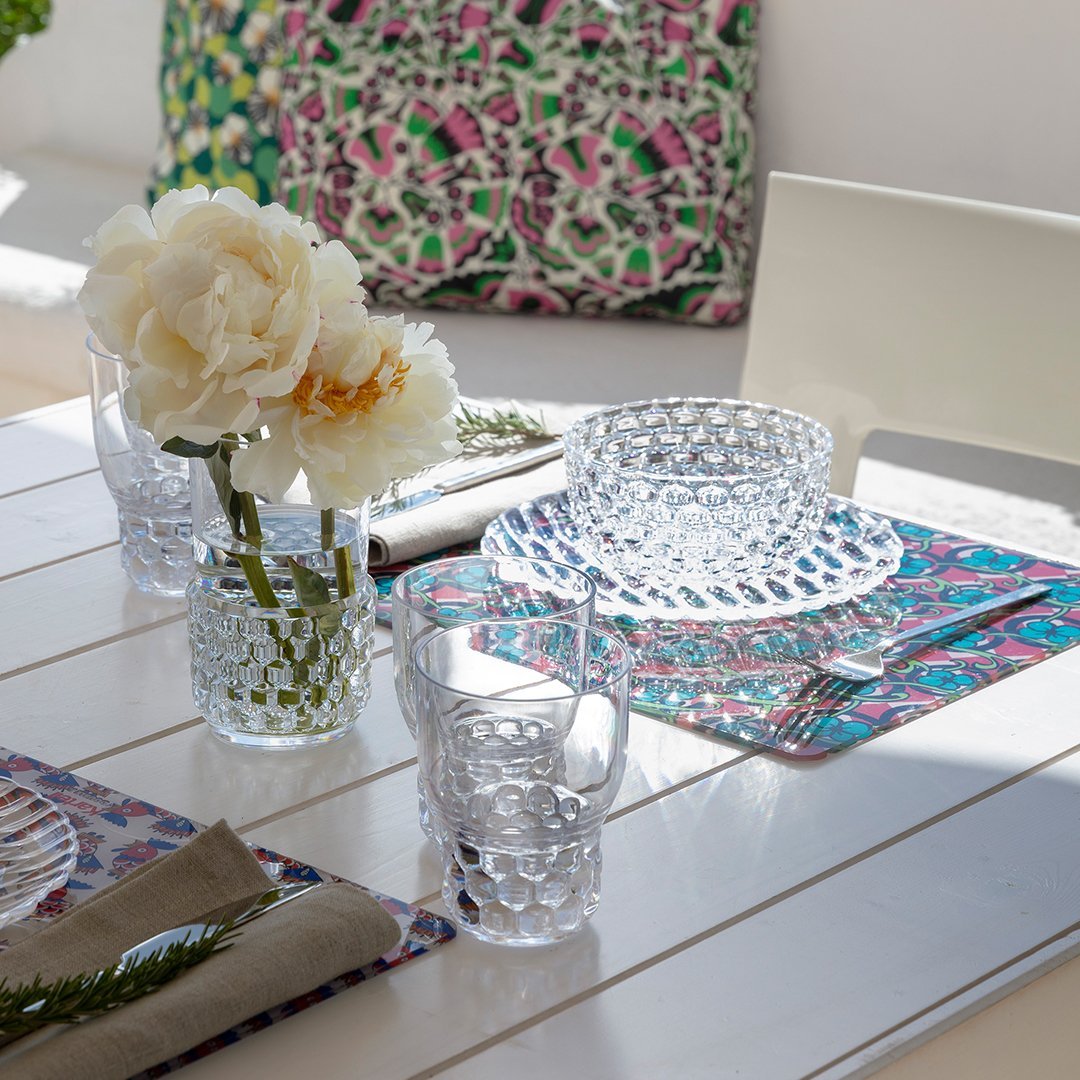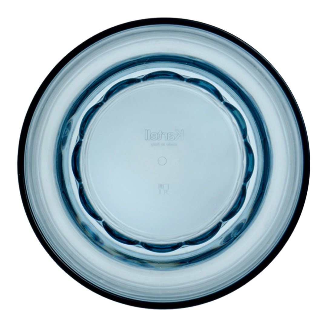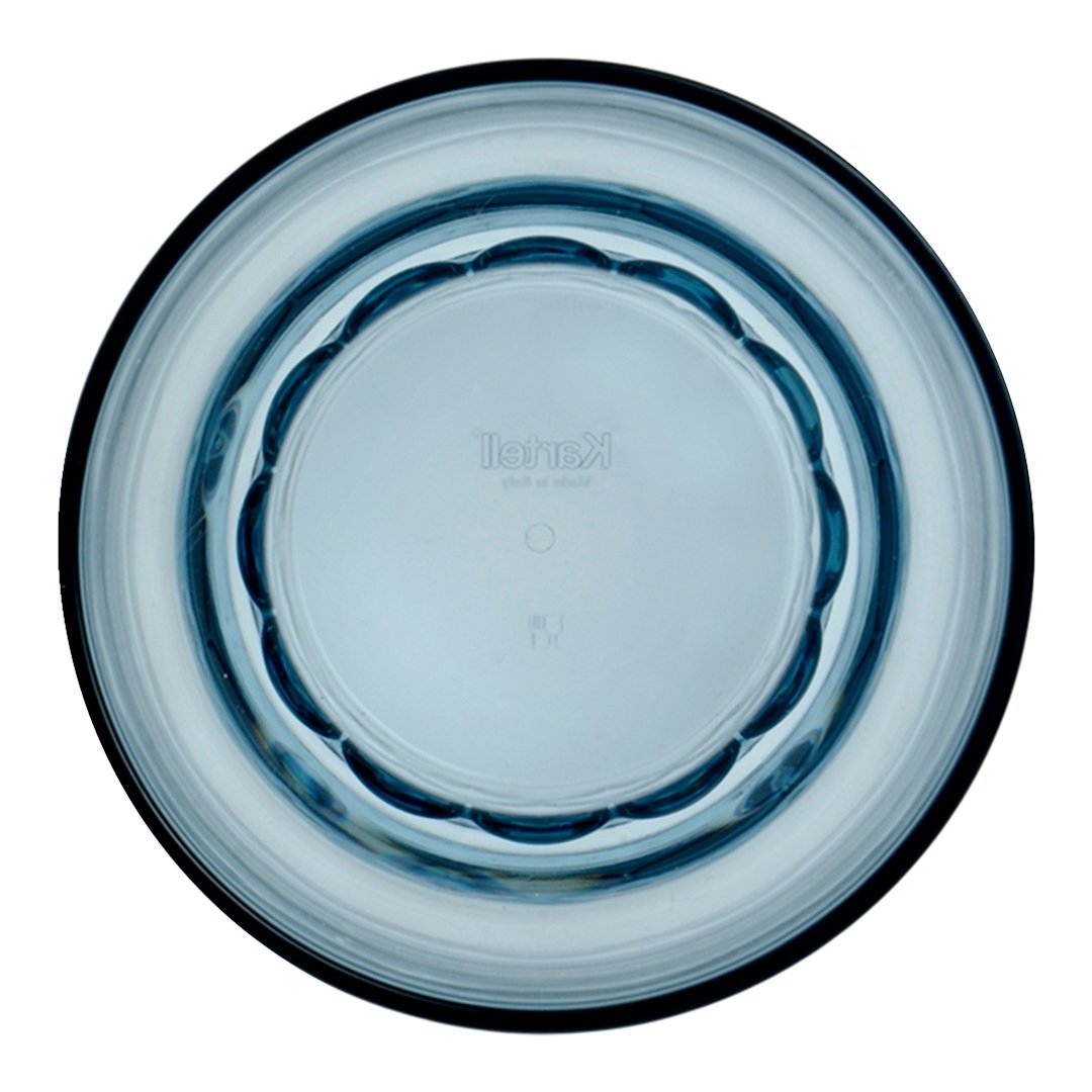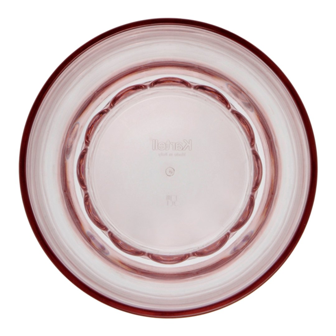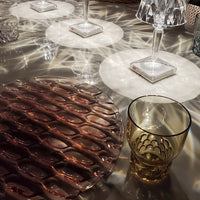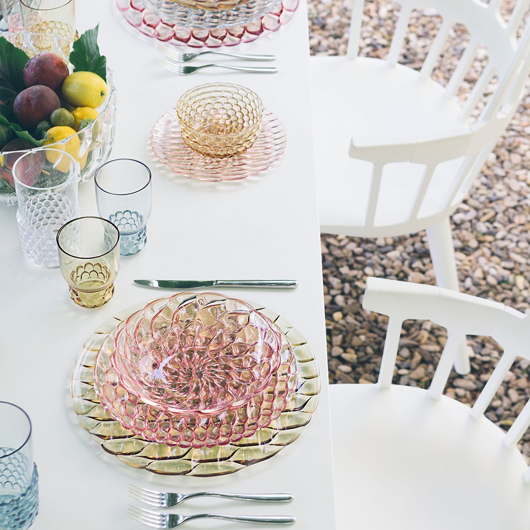 A comprehensive line of plates, trays, glasses, bowls and carafes made from colourful and transparent PMMA plastic. The line's individuality is down to the fact that each model presents a different organic pattern that has clearly been inspired by nature, harking back to the moulds that were once used for making jellies. This design highlights temporality, and therefore also variety, from smallest to largest. The faint, delicate and accessible transparent colours are suitable for furnishing any kind of table: creative and original, or more classic and monochrome.