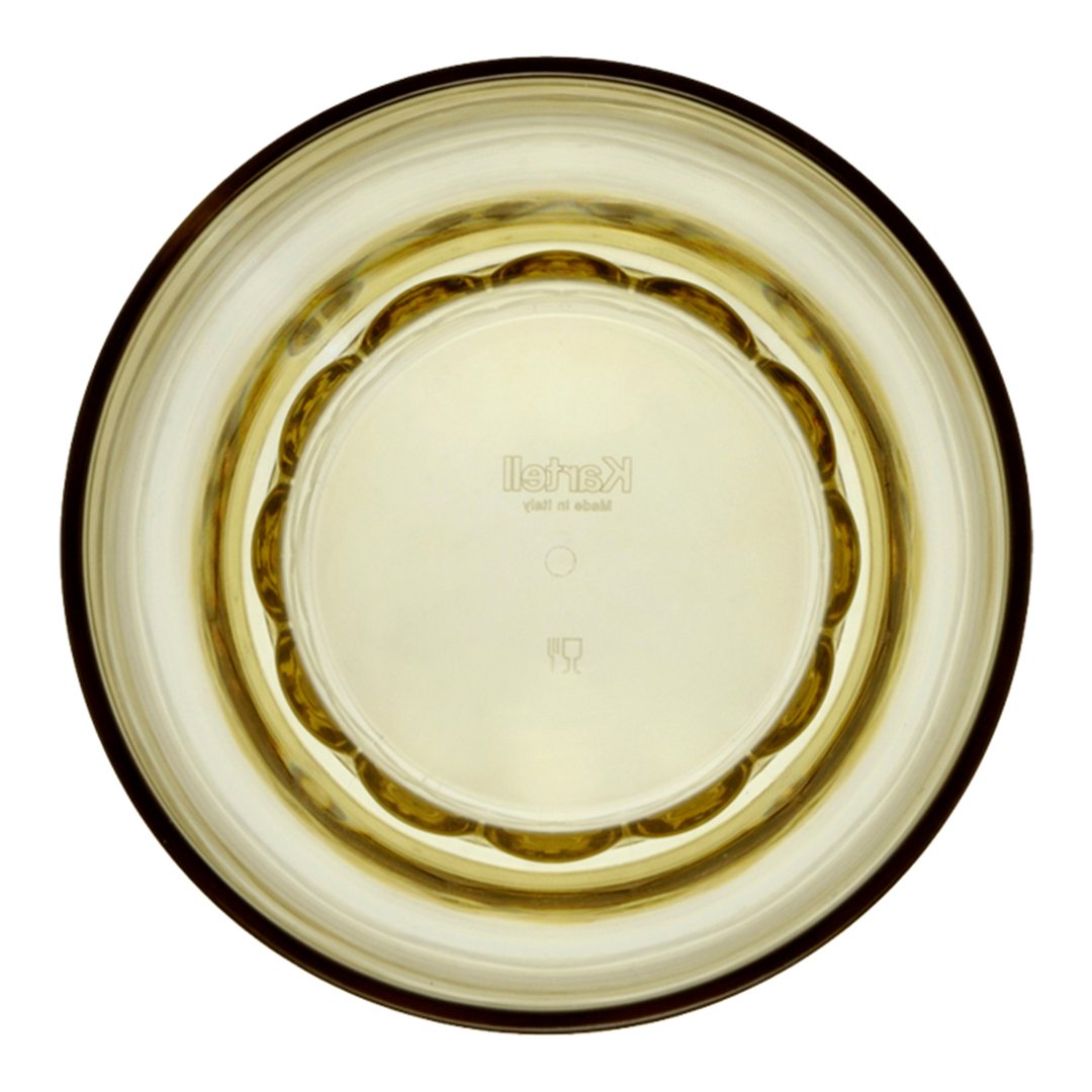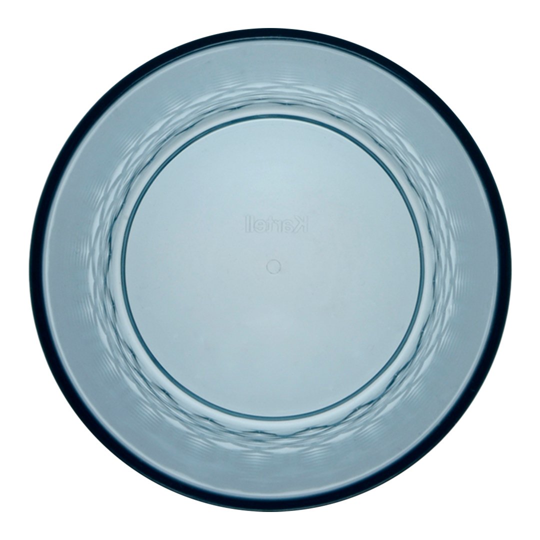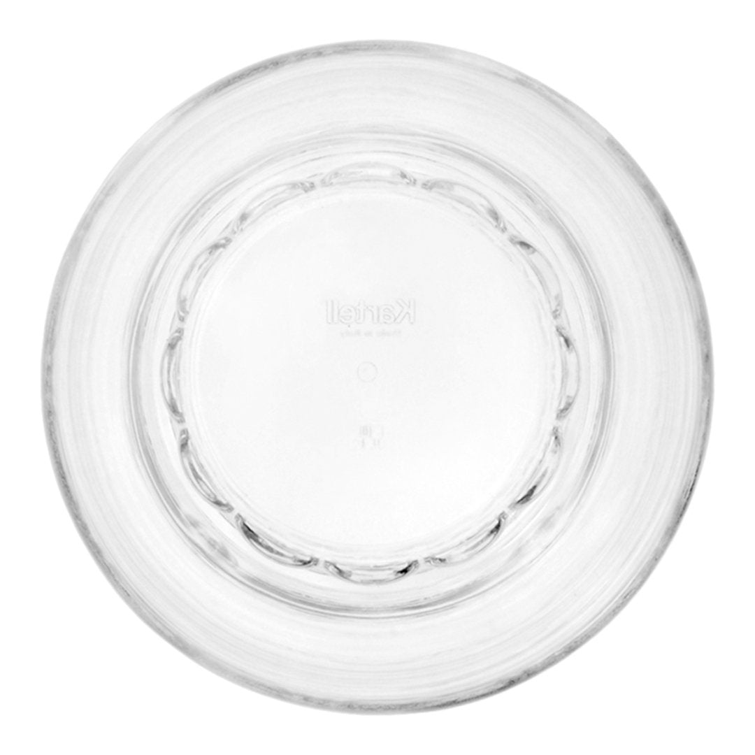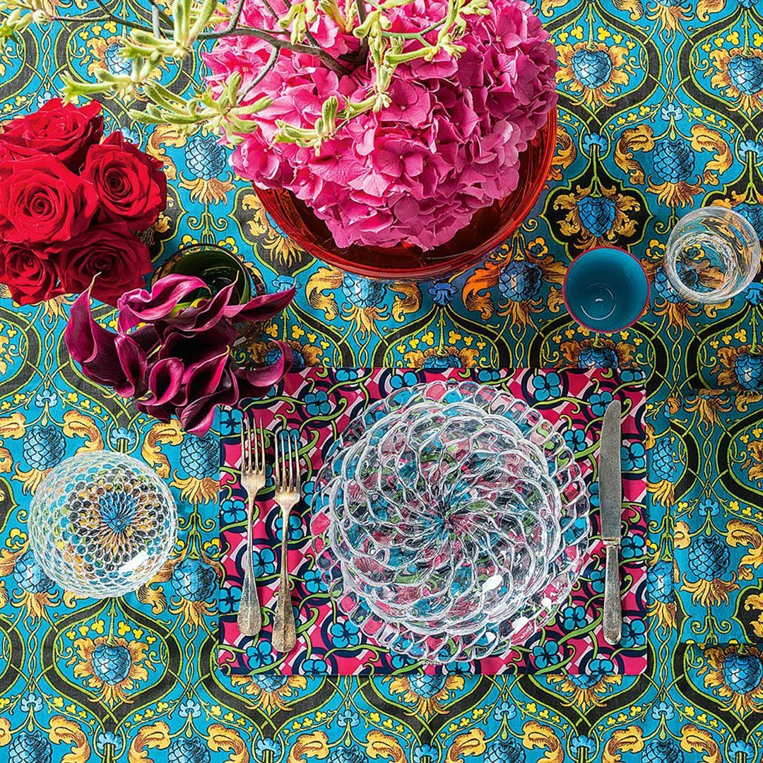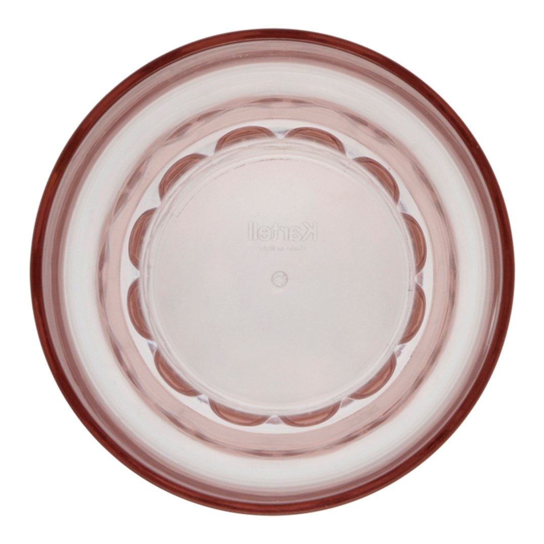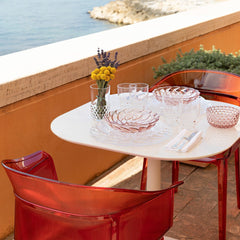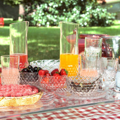 A comprehensive line of plates, trays, glasses, bowls and carafes made from colourful and transparent PMMA plastic. The line's individuality is down to the fact that each model presents a different organic pattern that has clearly been inspired by nature, harking back to the moulds that were once used for making jellies. This design highlights temporality, and therefore also variety, from smallest to largest. The faint, delicate and accessible transparent colours are suitable for furnishing any kind of table: creative and original, or more classic and monochrome.