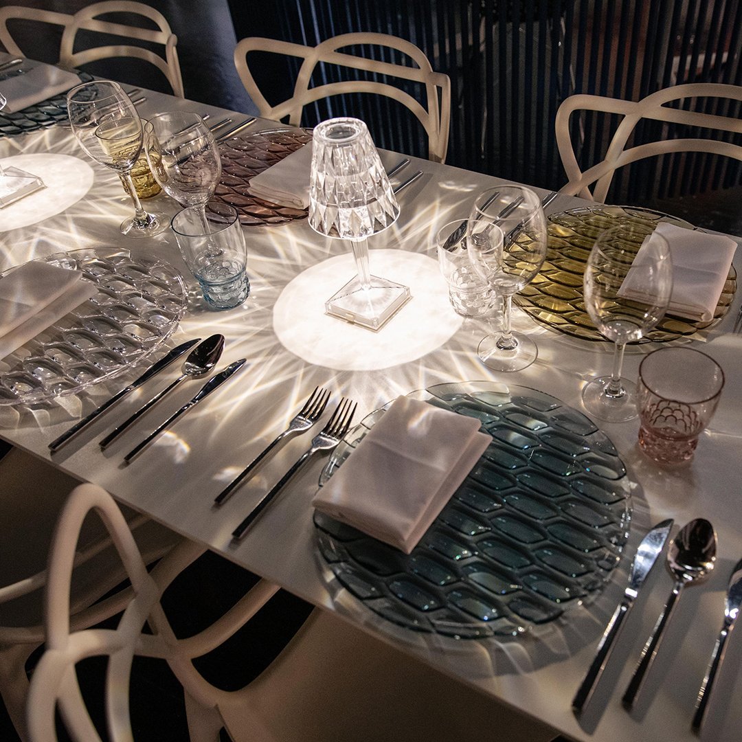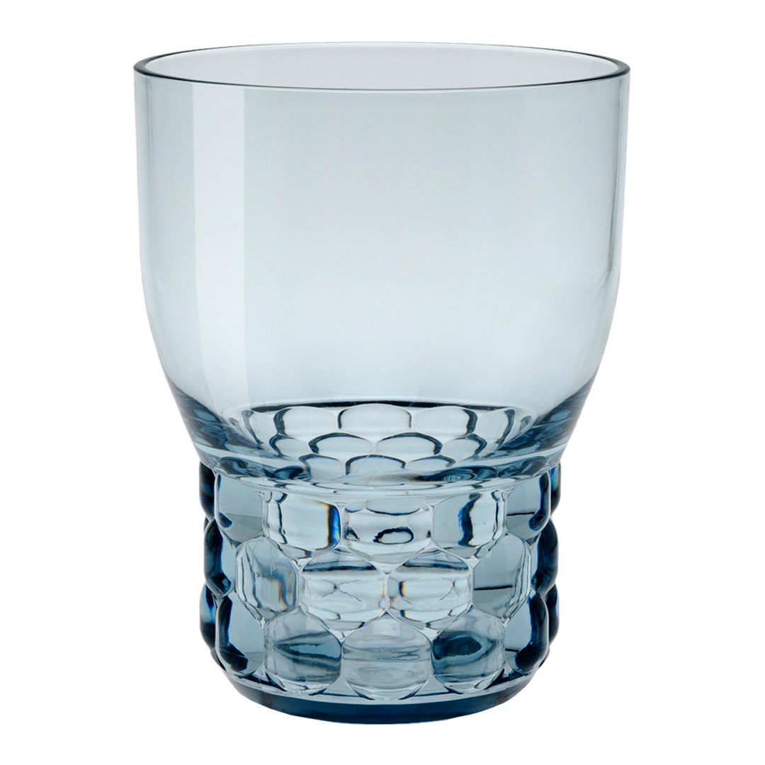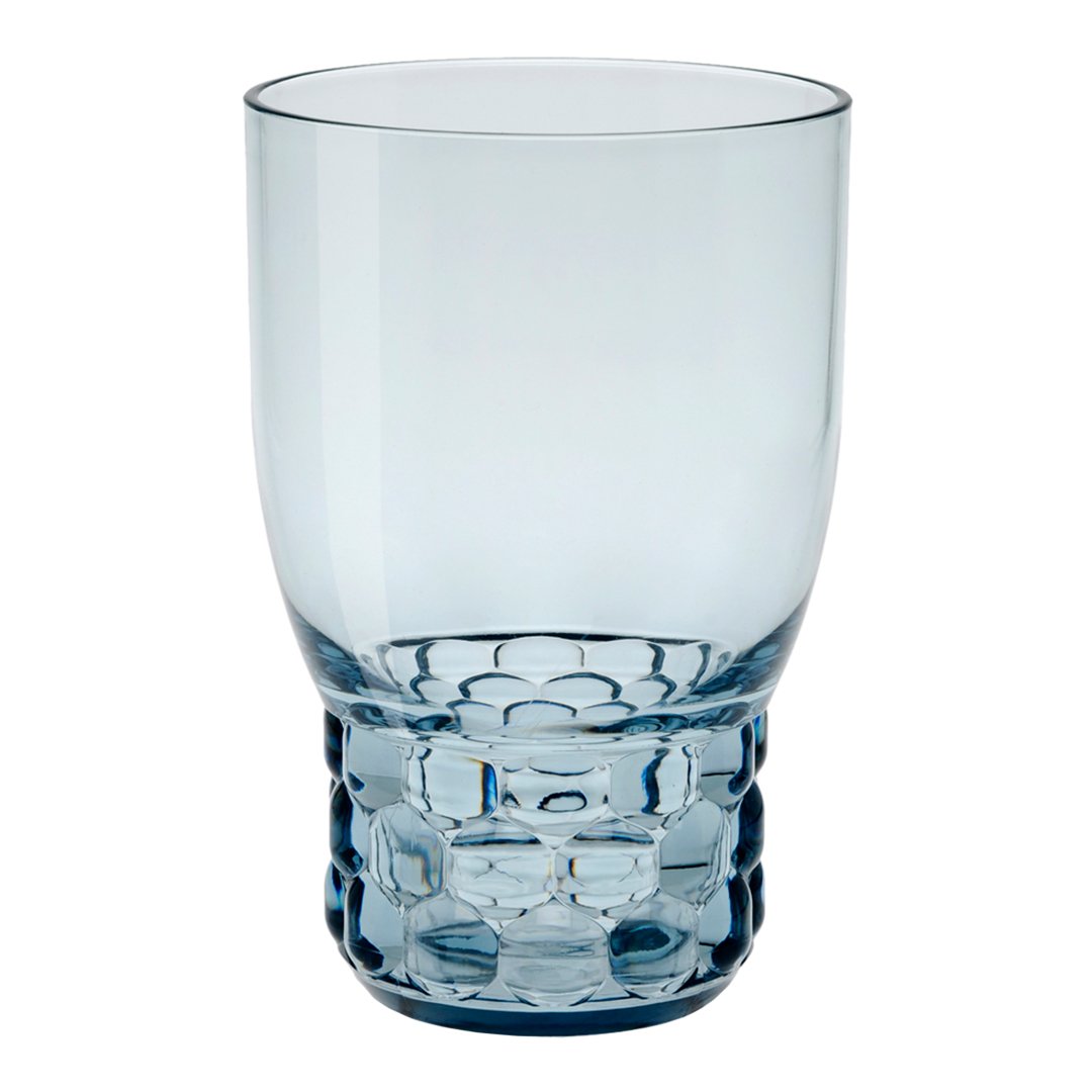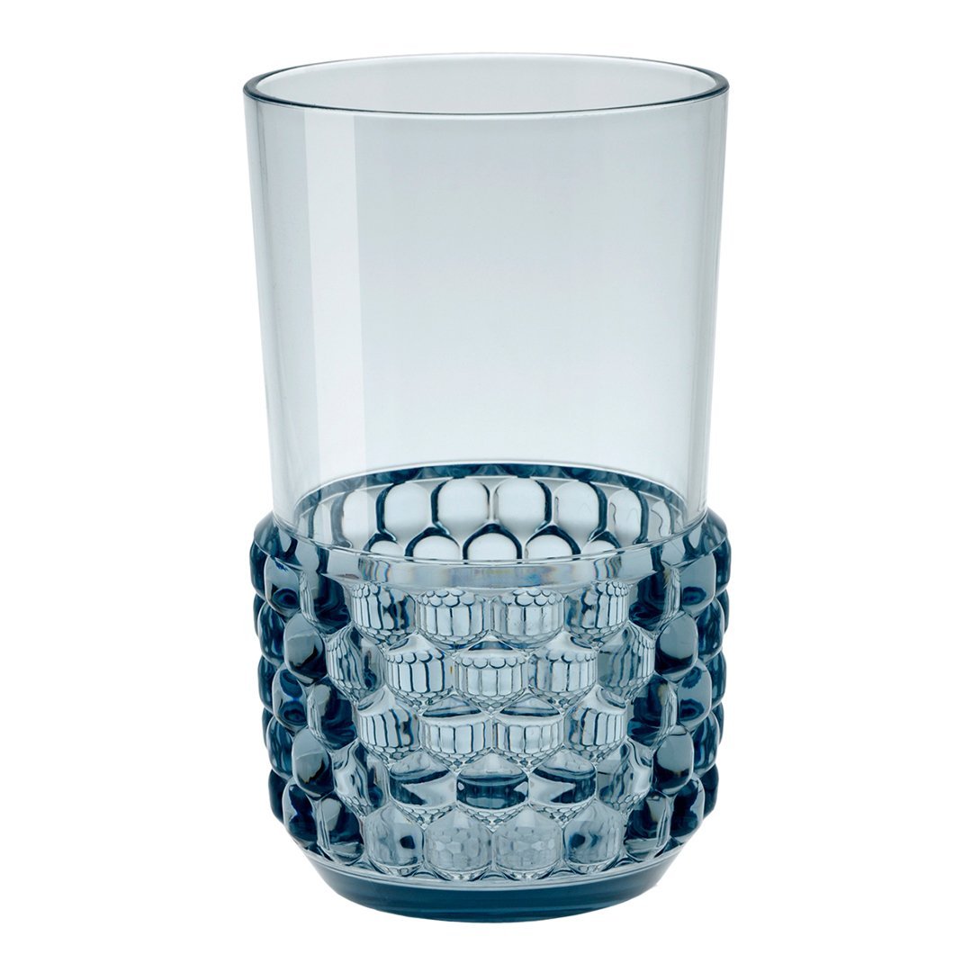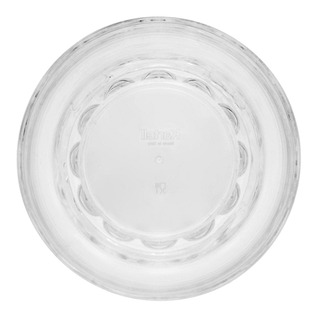 A comprehensive line of plates, trays, glasses, bowls and carafes made from colourful and transparent PMMA plastic. The line's individuality is down to the fact that each model presents a different organic pattern that has clearly been inspired by nature, harking back to the moulds that were once used for making jellies. This design highlights temporality, and therefore also variety, from smallest to largest. The faint, delicate and accessible transparent colours are suitable for furnishing any kind of table: creative and original, or more classic and monochrome.