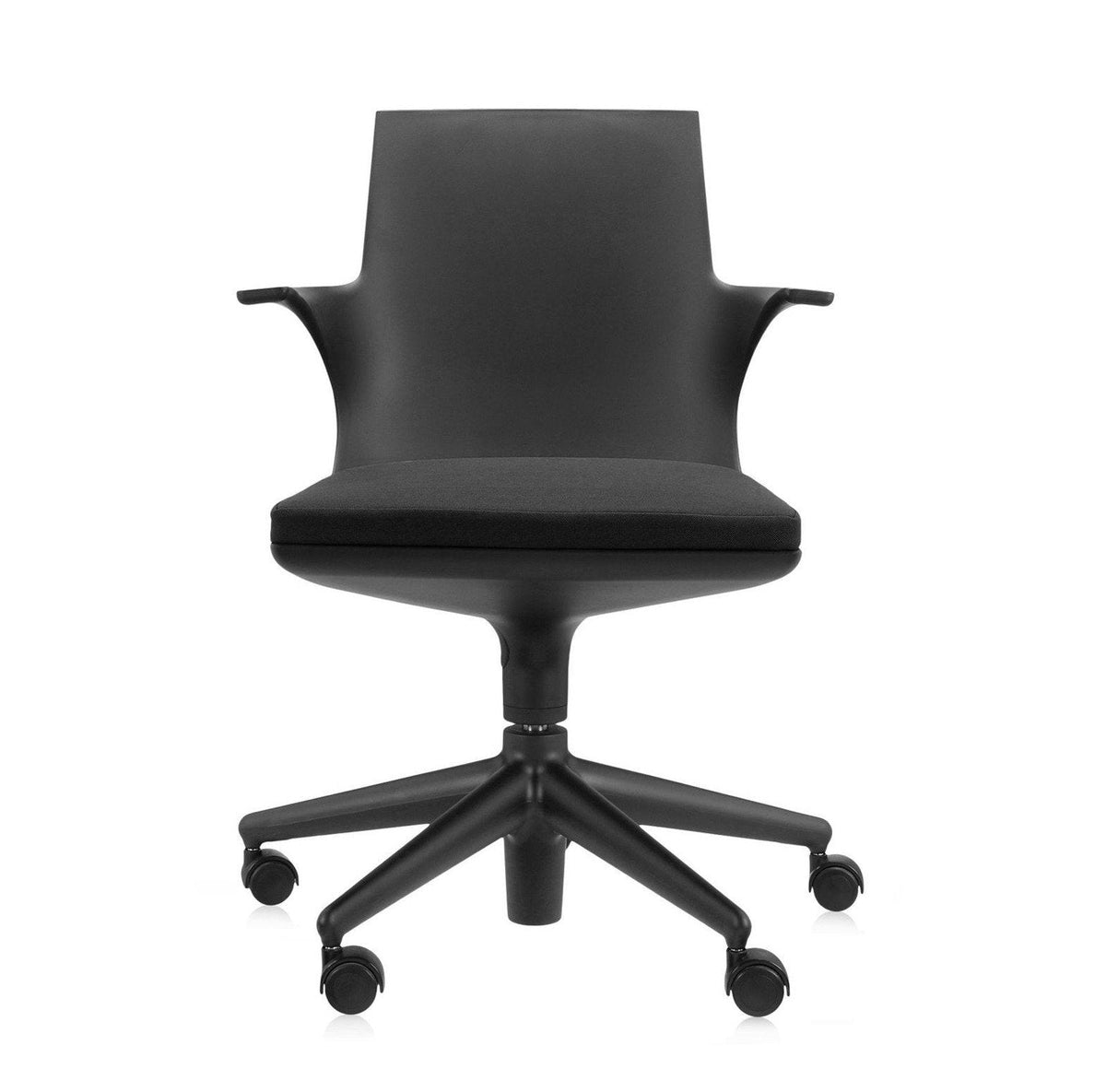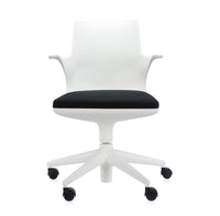 A monoshell light office chair on casters, Spoon Chair is the result of a totally avant-garde production process. The innovative dual-component injection molding technology used to produce this chair creates a layered product. Two different thermoplastics are molded at the same time, one for beauty (exterior) and the other for its high mechanical resistance, giving Spoon Chair its highly technological characteristics and maximum flexibility which comes from its highly customizable thickness which adapts to the users weight. The easy-to-use handle regulating the mechanism is concealed inside trunk of the bottom shell to avoid interrupting its sinuous line. Ideal for offices.