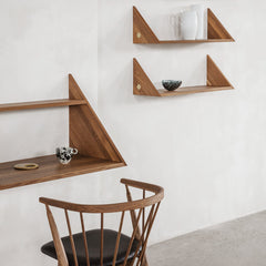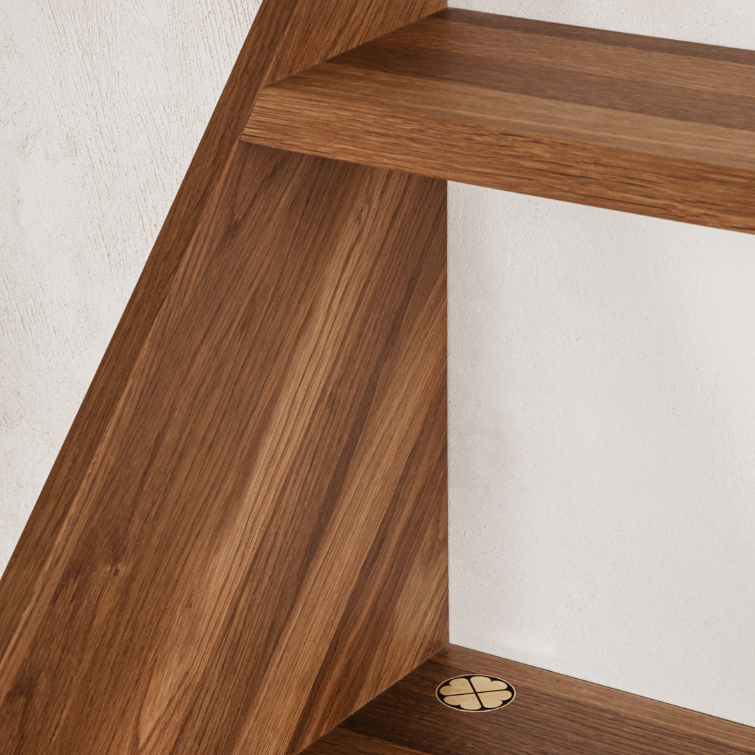 Sibast Furniture worked with danish artist Kasper Eistrup in developing the XLIBRIS series. It consists of two pieces of multifunctional furniture: a wall-mounted, self-supporting shelf and a matching table, both with an ultra-slim silhouette and a light style, reminiscent of Japanese origami art. The design uses 45 degree lines from the side of the shelf to the front edge of the board. Kasper Eistrup’s artistic approach to design and his sense of detail are also evident in XLIBRIS, furnished with an exclusive brass emblem mounted on the side of both the shelf and the wall-mounted desk. The emblem is made up of four hearts joined into a four-leaf clover. The hearts symbolise a predilection for necessity, functionality, the material and the craft – all of which were involved in the development of XLIBRIS. Both the shelf and the wall-mounted desk are assembled without visible screws, emphasising the impression of XLIBRIS as two integrated pieces of furniture that seemingly grow out of the wall.