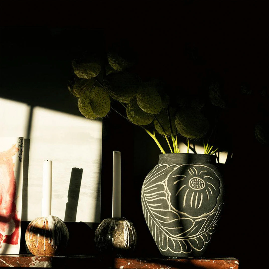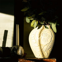 Frida Vase is a ceramic vase with a waterproof, matte coating that gives it a natural appearance. Designed with a carved out pattern that adds texture to the curved shape. Perfect for mixing and matching with other colors and shapes from the vase collection.