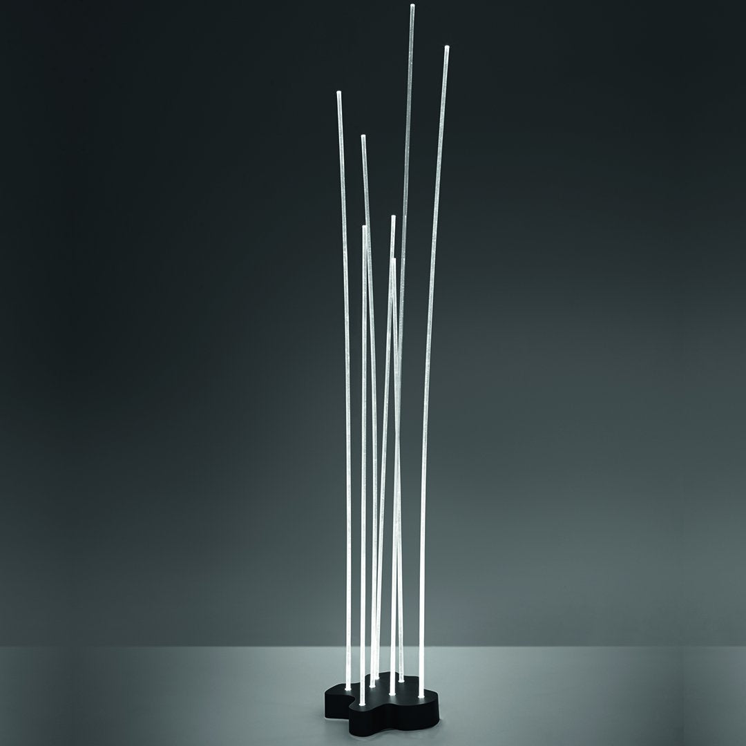 Seven flexible, transparent PMMA rods create tubes of LED light flowing upwards from a black painted aluminum base.