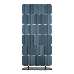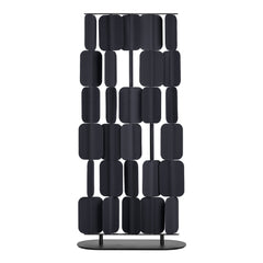 The single panel is composed by a multilayer sheet of polyester and textile installed on a steel tube. Steel plate base for the free-standing version, metal rail for the ceiling hanging version.