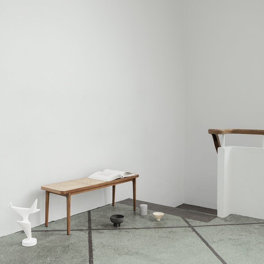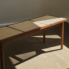 The Le Roi is a bench made from solid oak with inlaid French rattan mesh. Le Roi is the French word for King, and the series is a minimalistic interpretation of rattan furniture from the French colonial time, merged with well known Scandinavian furniture archetypes, such as the three-leg circle table and the rectangular bench.