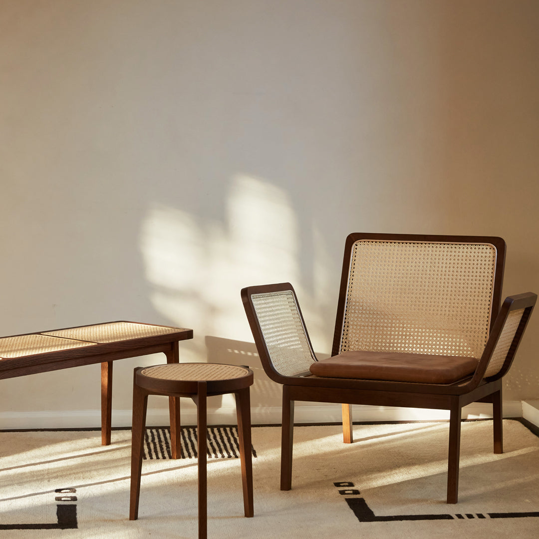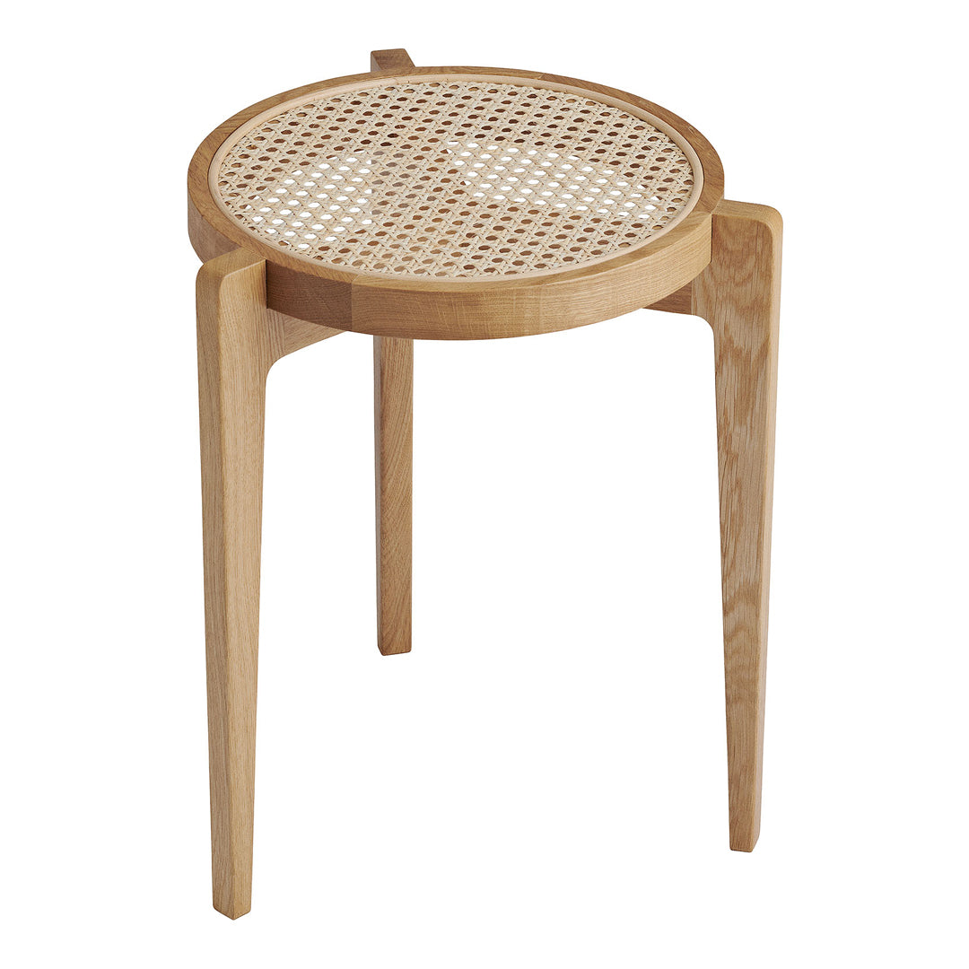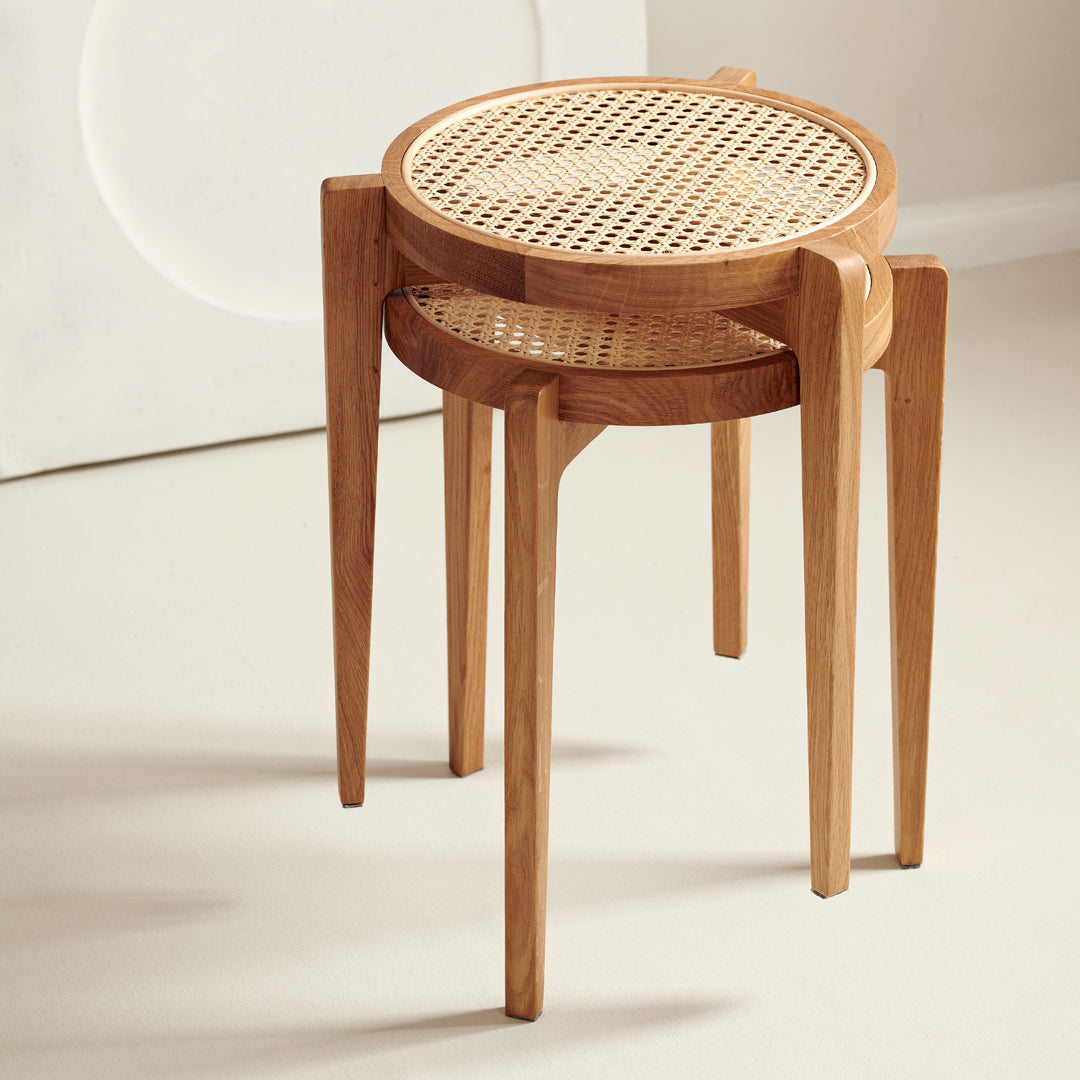 The Le Roi Side Table is a minimalistic interpretation of the classic Scandinavian three-legged stool. The side table is made from solid ash with inlaid rattan mesh and can be stacked to save space in a spiralling sculpture.