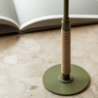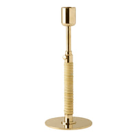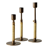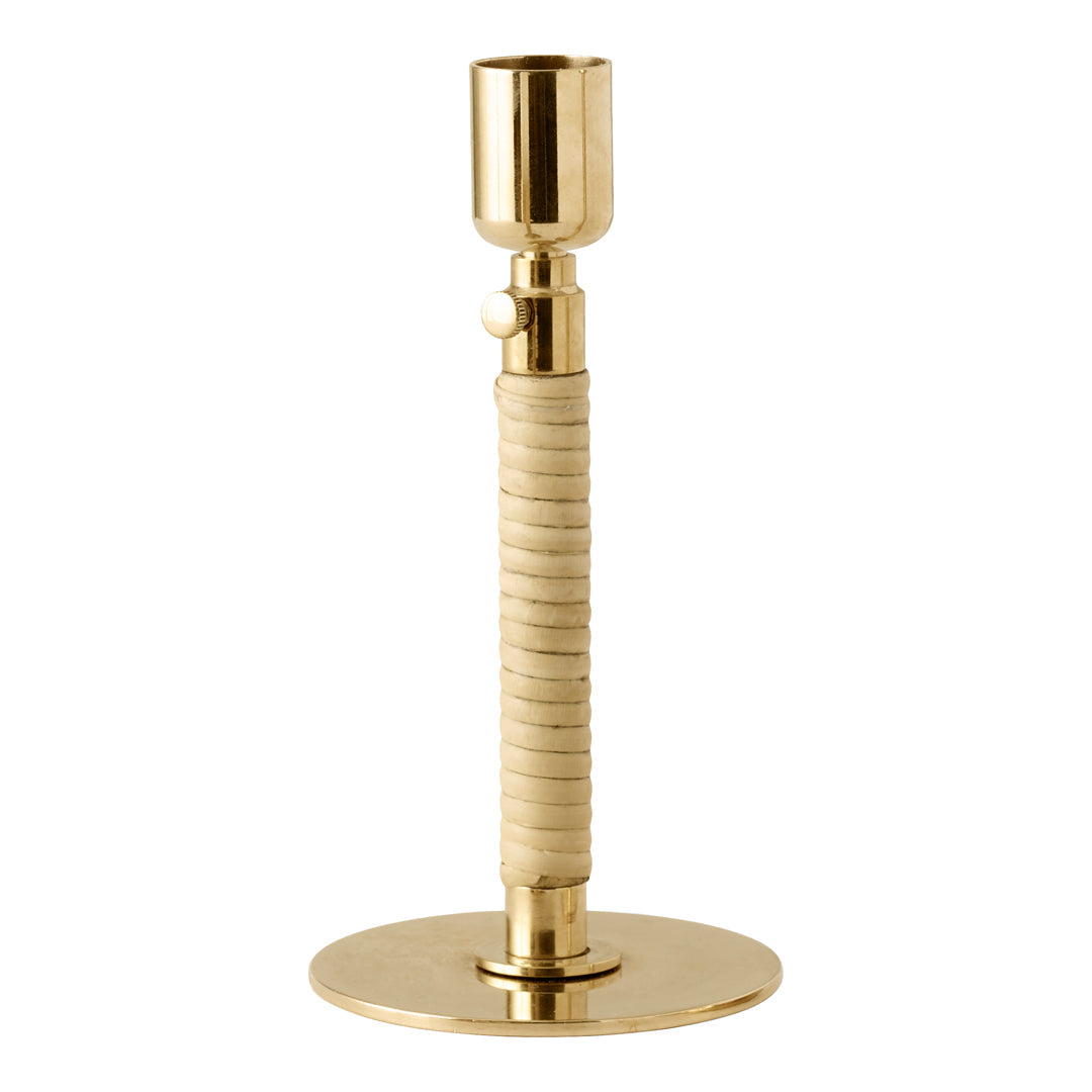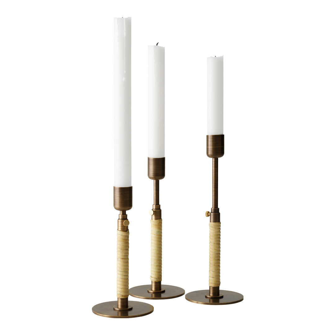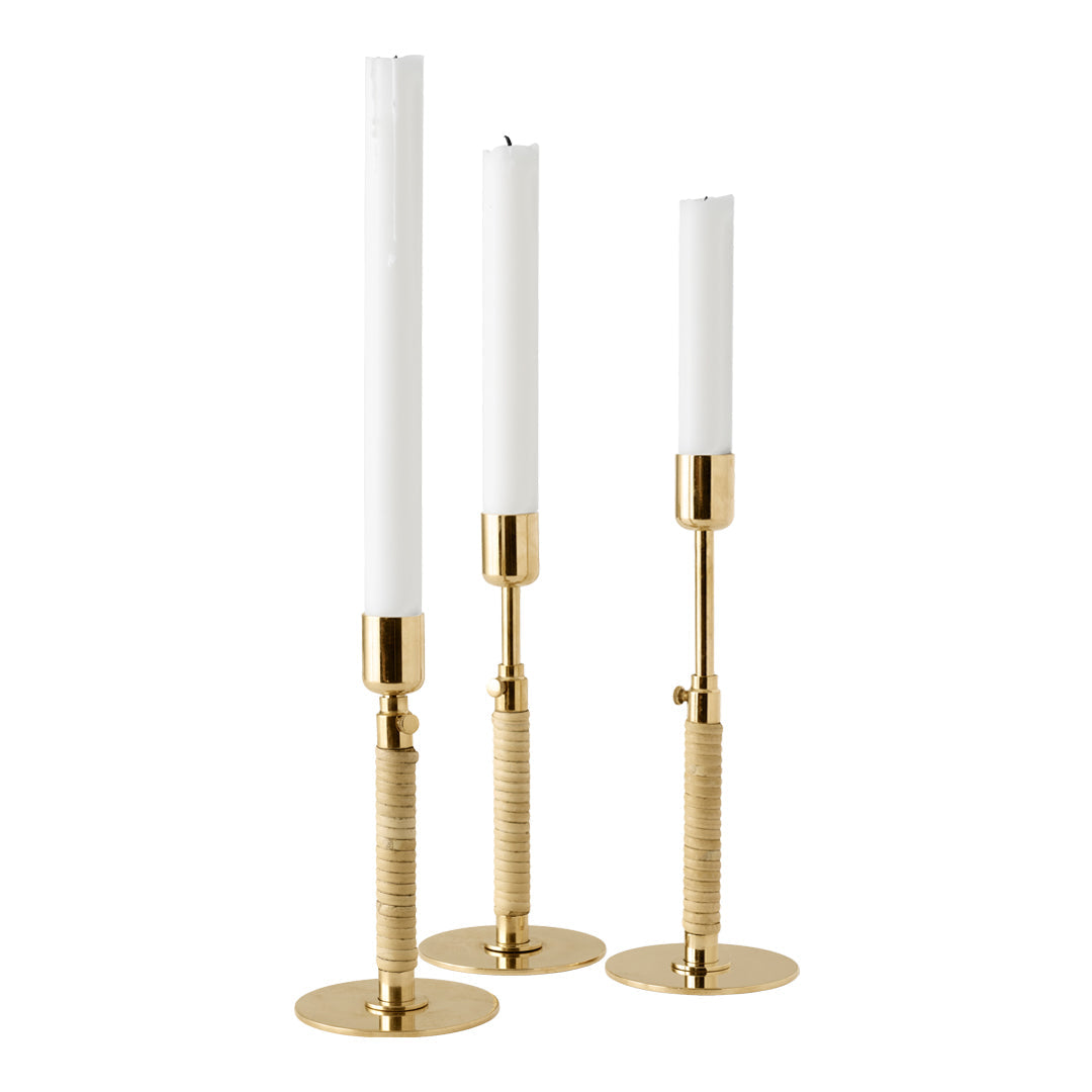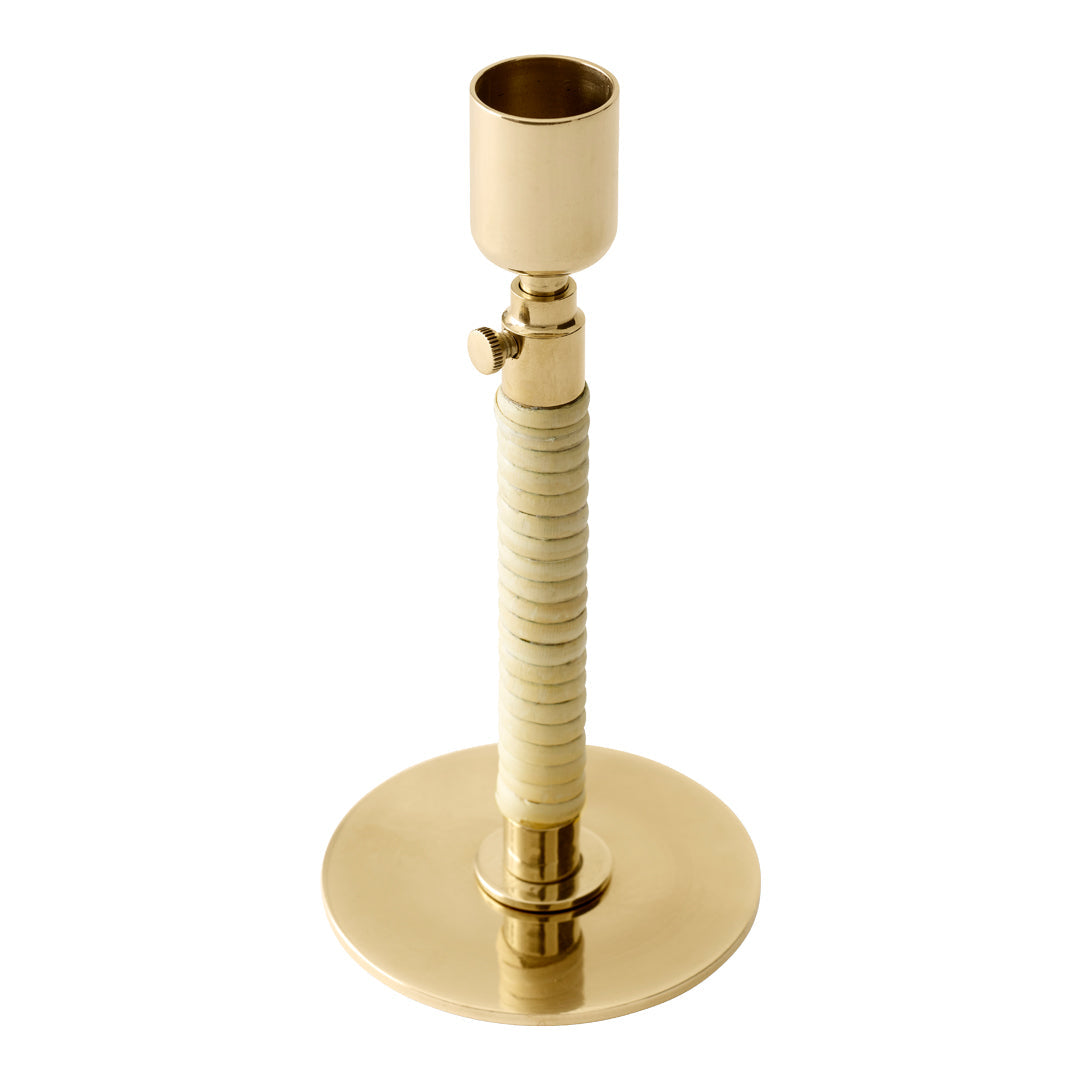 Taking its name from the Latin word for "extend," the Duca candleholder does exactly that: by loosening the screw on its slender stem, the height of the design can be adjusted as the candle burns. Cast in polished or bronzed brass and detailed with rattan enfolded around its lower half, the simple yet impactful design brings a sense of intimacy and warmth to its surroundings.