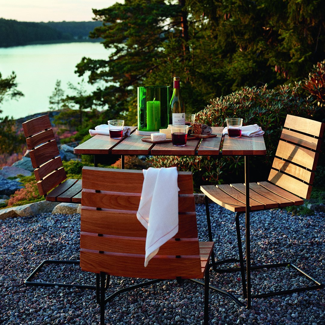 The springy sensation makes this chair feel almost like a rocking chair. Amazingly comfortable. Even though the design, with the frame subtly piercing through the slats in the back, isn’t that, er, voluptuous. All teak is A-grade teak from controlled plantations (with a possibility to FSC certify the teak).