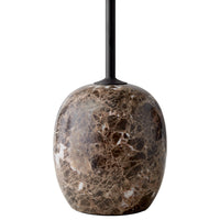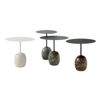 Available in two distinct profiles – the round LN8 (15.7" diameter) and oval LN9 (19.7" x 15.75") – each Lato table balances a slim tabletop against a sculptural marble base. The base, offered in luxurious options including Emperador, Crema Diva, or the striking Verde Alpe marble, is expertly turned on a lathe and finished to a refined semi-matt texture. This substantial foundation supports a slender powder-coated steel stem that appears to defy gravity as it suspends the tabletop above.