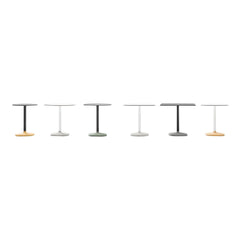 A table with almost archetypal lines, born of a softened re-elaboration of its geometries. The soft round concrete base, coloured in the mass from the catalogue palette or even colour customised, houses the cylindrical metal structure supporting the top in the mdf or laminate versions. It is available in 2 heights, with a square shaped top and rounded corners, or a curving shape formed by the combination of arches evolving from circles of diaerent diameters. Thanks to its essential shape, which makes it easy to combine with all chair types, the table is ideal for those contract contexts dedicated to the food and hotel sectors: the materials furthermore, make it suitable for both interiors and verandas, for open-air terraces and, more generally, for outdoor areas.