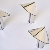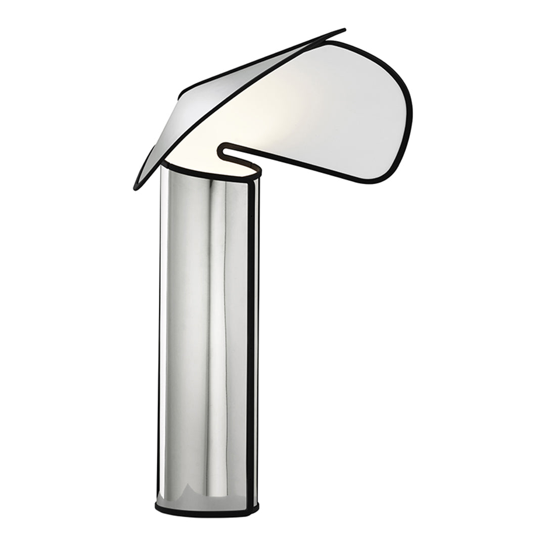 The Chiara lamp, designed by Mario Bellini for Flos in 1969, is an iconic design formed from a simple sheet of polished stainless steel that has been cut and rolled into a cylinder. This origami-like structure hides a lighting source - updated to LED in this re-edition - placed on the floor. The light it provides is reflected and diffused by a large ‘hat,' which resembles a nun's wimple and veil. The re-edition of Chiara uses cutting-edge technology and comprises 2 models: the classic floor lamp in stainless steel with black edges and a new smaller table model in a variety of finishes.