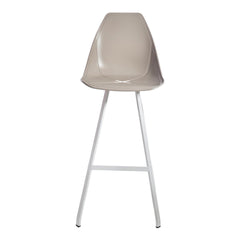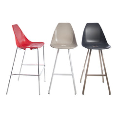 Stool in chromed or painted steel or stained ash wood, 4 legsor skid frame or beech. Inox footrest. Shell in homo-copolymer,“X” on the seat in contrast or in color (wood or plastic material).Available in two heights.