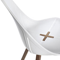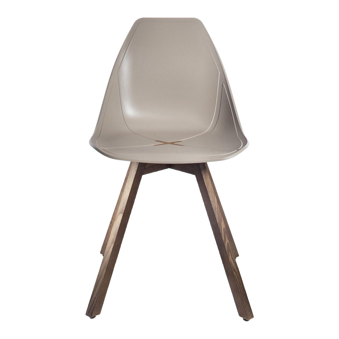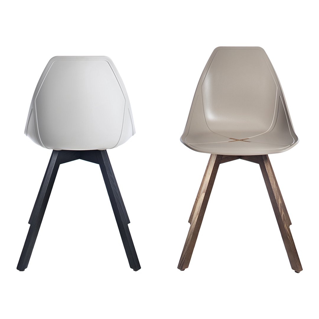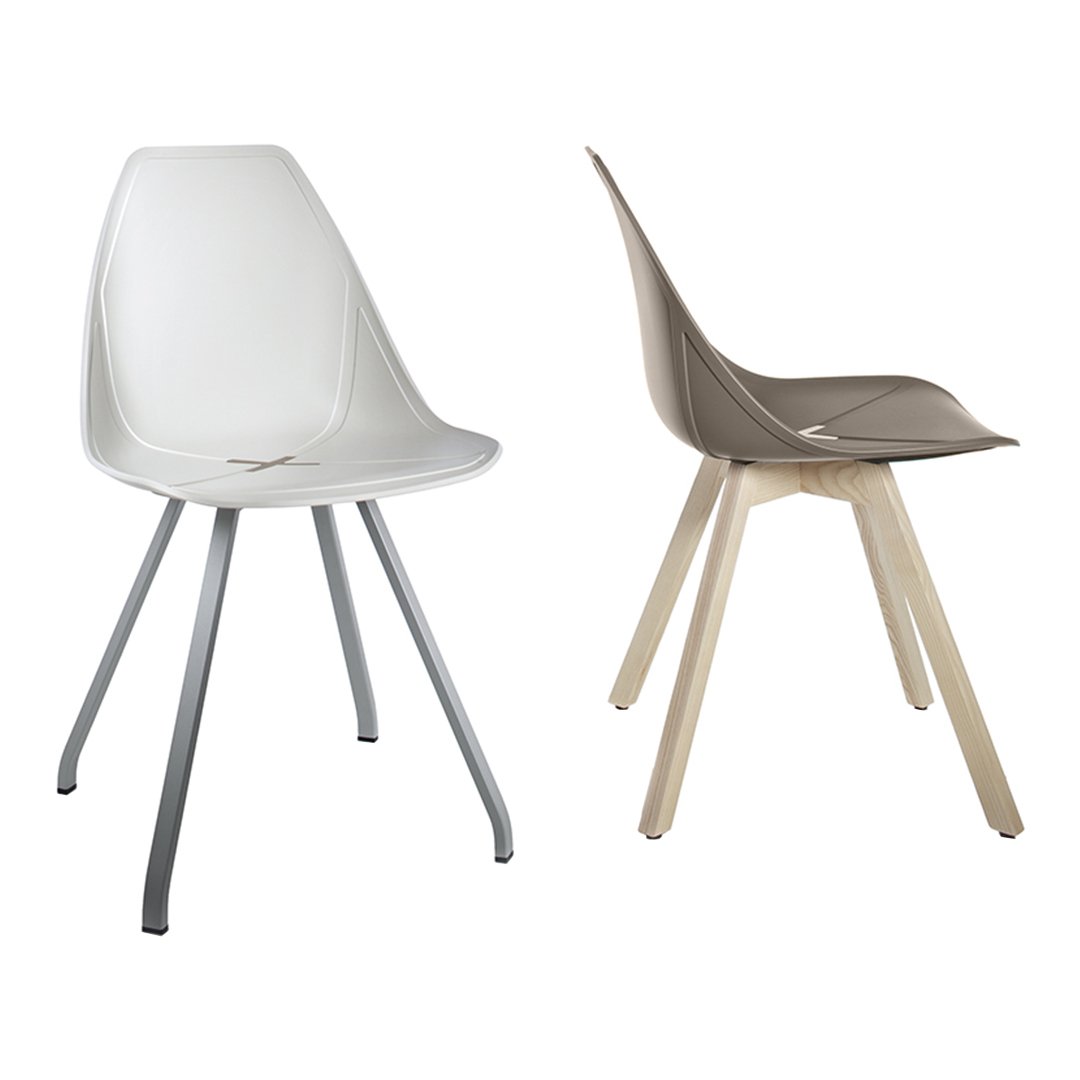 Chair in chromed or painted steel or stained ash wood, 4 legs(also swivel version) or skid frame.Shell in homo-copolymer, “X” on the seat in contrast or in color(wood or plastic material).