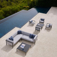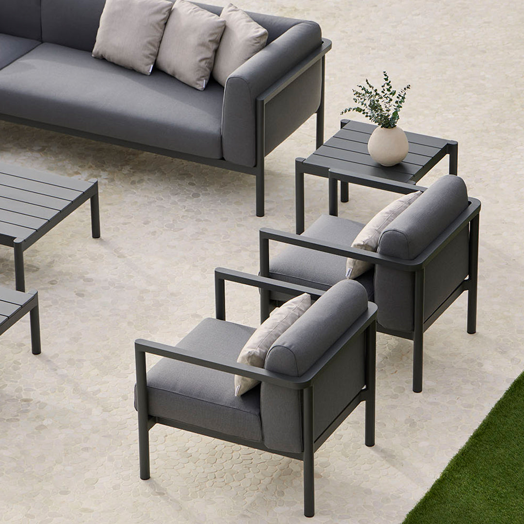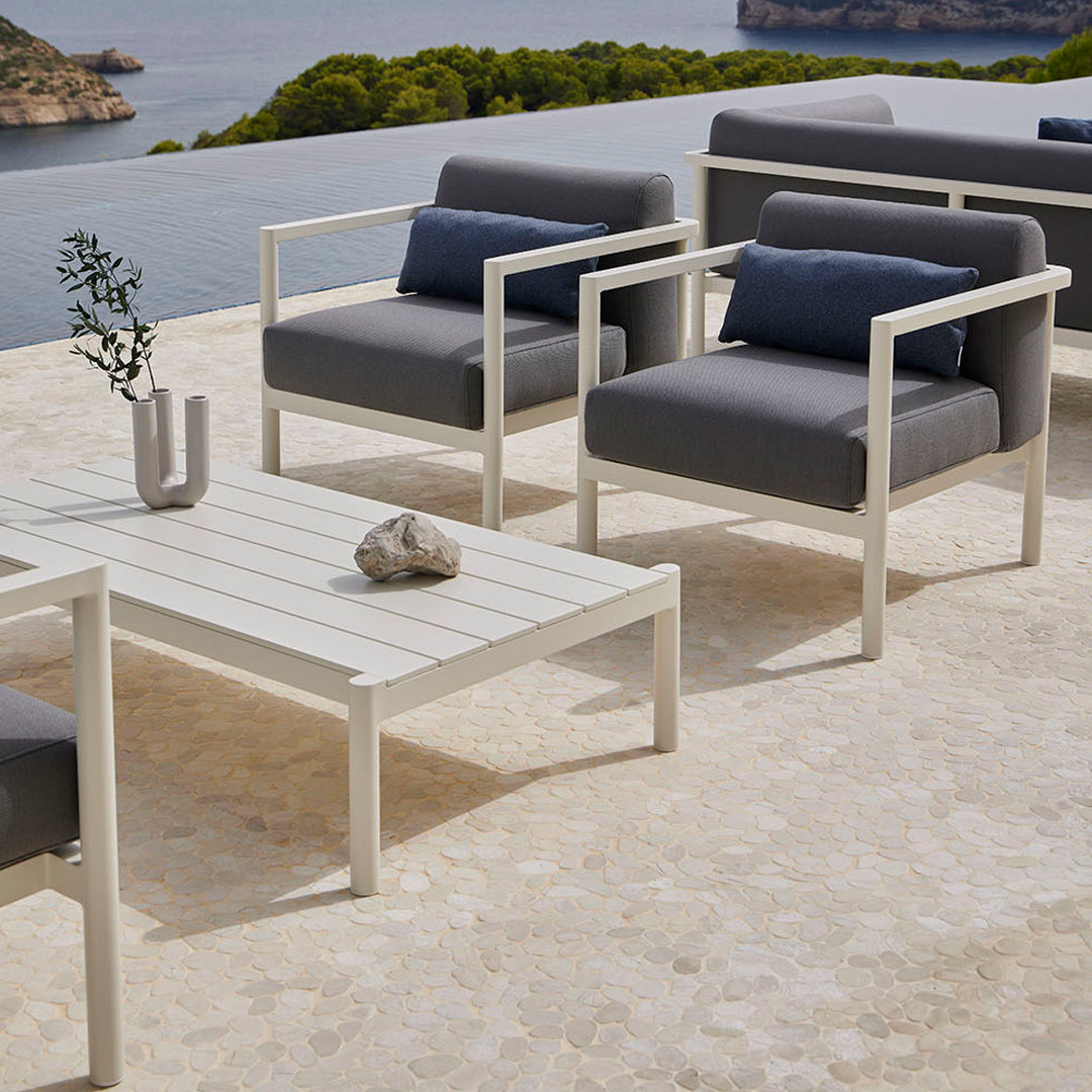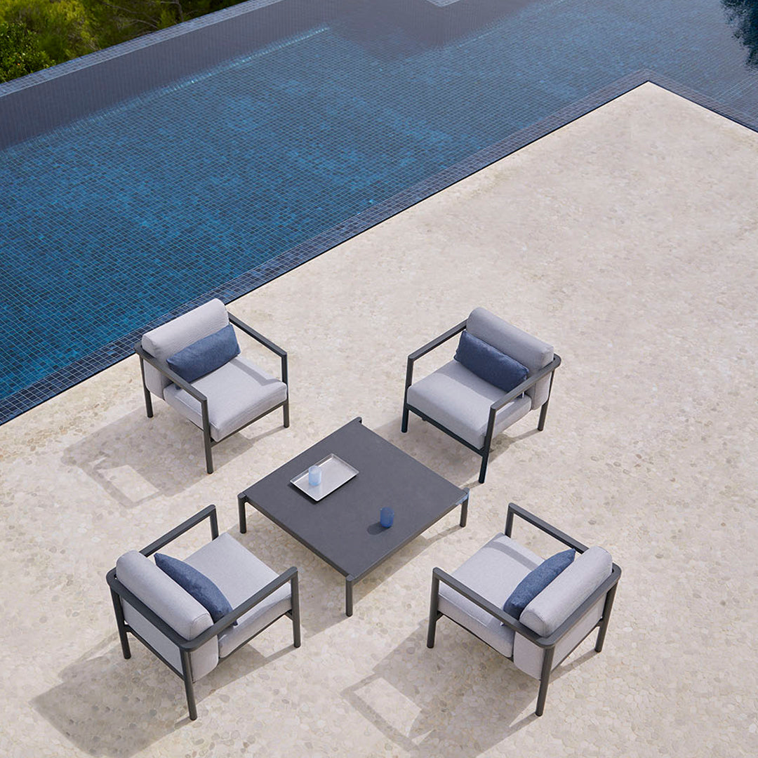 The structure of all the pieces is made from powder painted aluminum finished. This material was chosen for its durability and because it is 100% recyclable at the end of its useful life. The surface of the seats and backs of the chairs and loungers is made from texiline and the cushions are upholstered in fabrics with guaranteed resistance against sun exposure. Origin is a long-lasting collection in terms of both materials and design –beyond ephemeral trends– because without durability there is no sustainability.