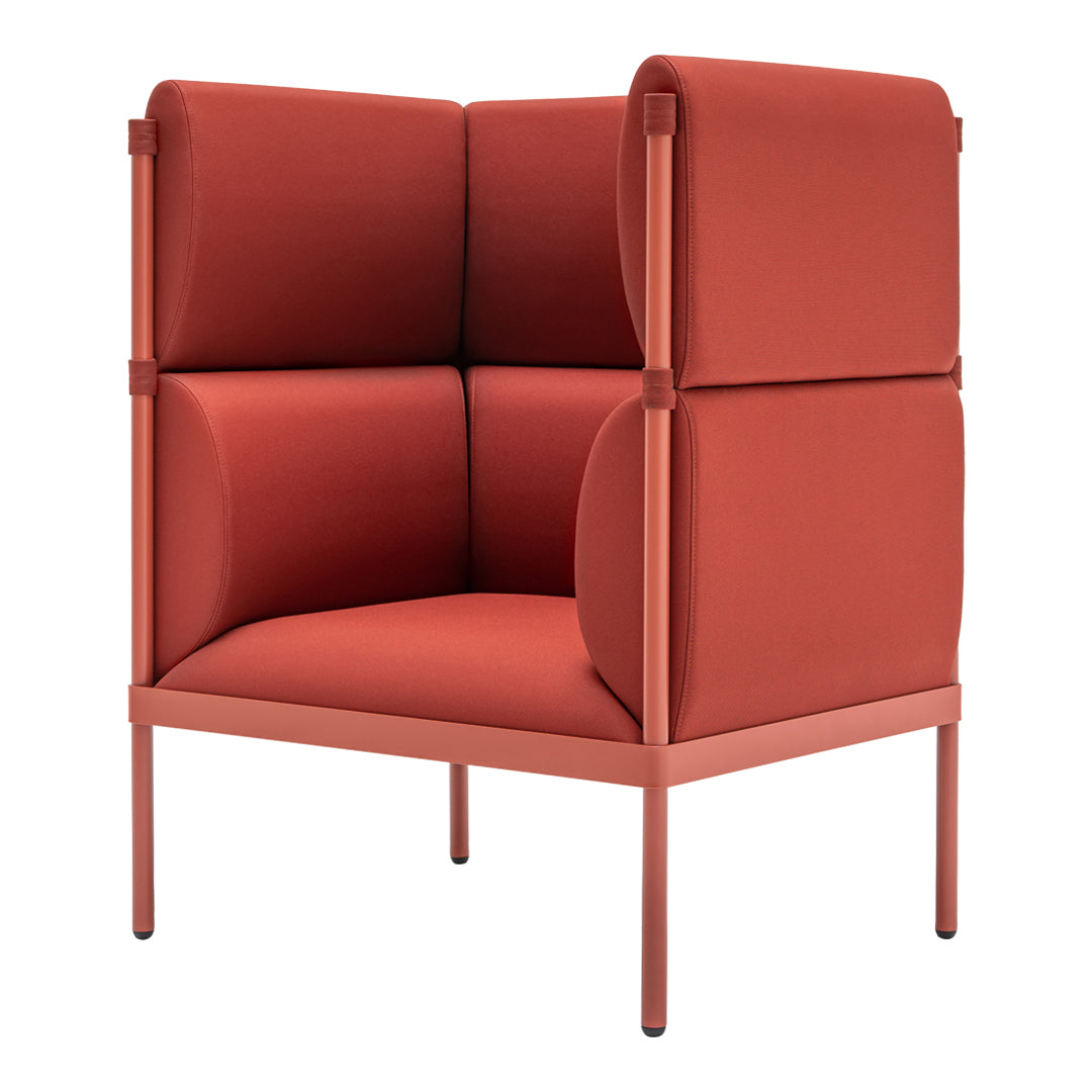 Following the concept of the stilt base, the high back variation takes a different approach to the way we designate spaces and zones. The Stilt armchair with the high back creates an acoustic niche establishing a firm point for short meetings or relaxation. Soft cushions upholstered in the finest quality fabrics ensure the comfort of use. Being a versatile piece of furniture, the Stilt armchair with the high back can be situated in numerous types of interiors, from residential spaces to office lounges.