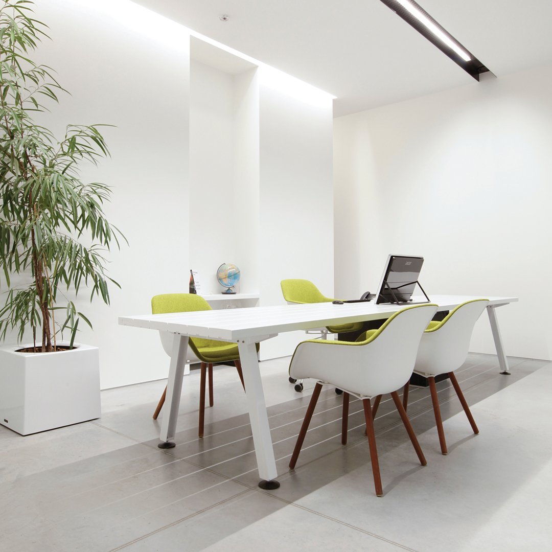 The Marina tables come in four different tabletop widths. One version has five fibreglass sections and the other version six sections. When you double the width of these tabletops, you get the perfect desk and have a slot for cable management and desk dividers. Marina also comes in four different tabletop heights. There is a version for normal seating height, and another for bar stool seating height. The number of table legs increases in proportion to the length.