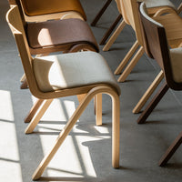 Available in natural or red-stained oak with a water based lacquered finish and offered with or without and upholstered seat or front, the pared-back dining chair showcases precise craft and natural materials to functionally beautiful effect. As an added feature, the upholstery can easily be changed by loosening four screws.