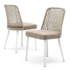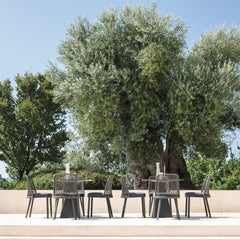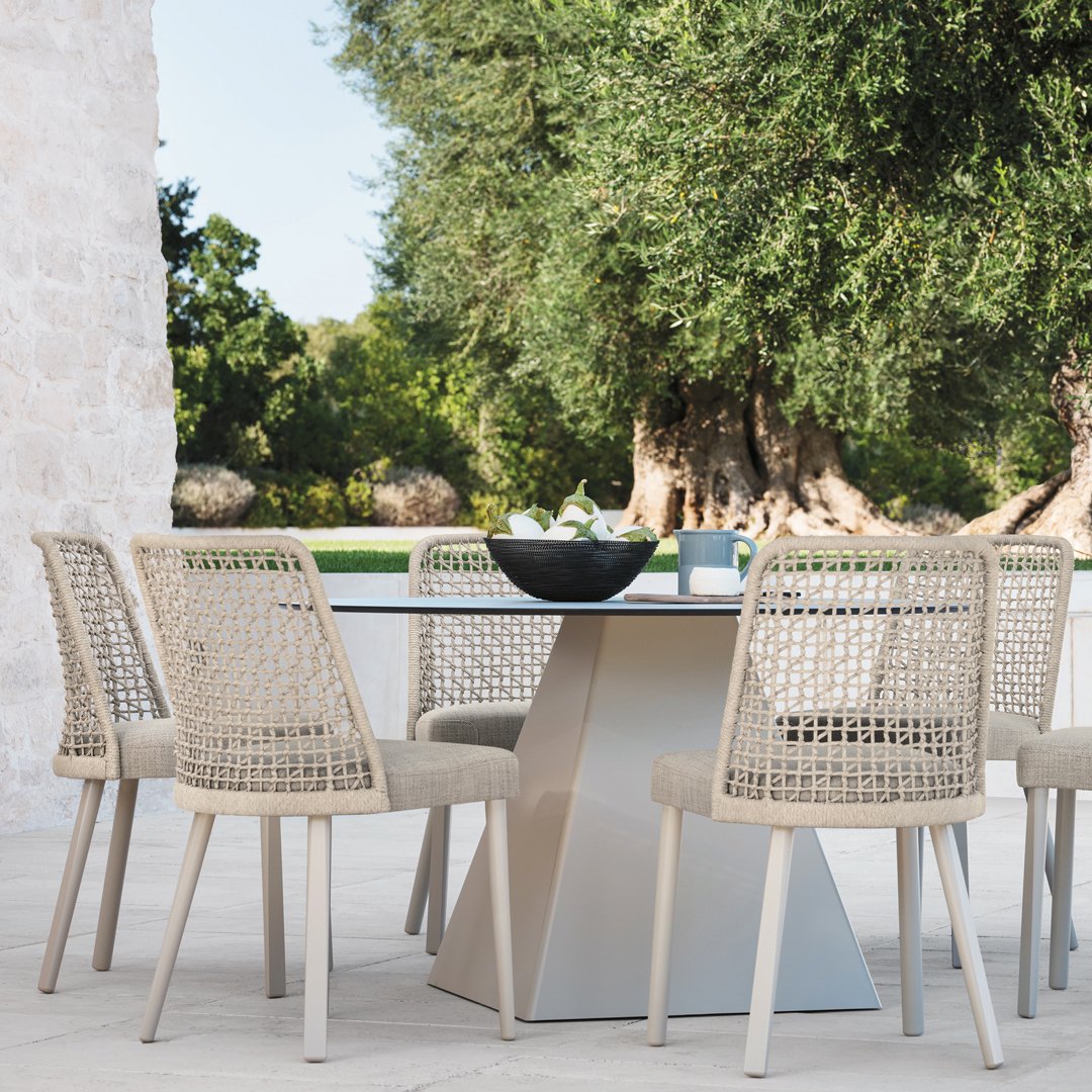 Emma is a versatile outdoor chair with powder coated aluminum structure, featuring numerous combinations of different materials and fabrics for seat, backrest and legs.