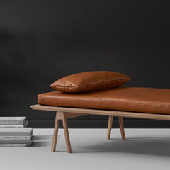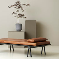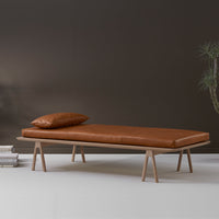 The Level daybed uses the iconic form of sawhorses in the simplest arrangement possible: A sheet laid across a pair toppen with a rectilinear mattress. The supple leather and the sturdy wood components elevate the simple whole. The daybed takes its name, Level, from a symmetry between the domestic and work environment; a generally sought-after condition.