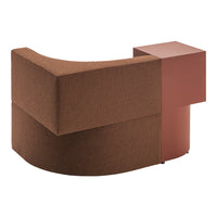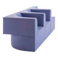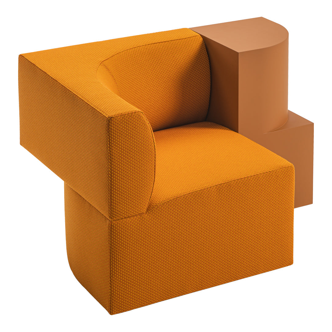 Each module seems to be sculpted directly from the rock of a quarry: a square block, solid and compact, sectioned by a curved cut to obtain two pieces that then overlap to create a backrest and seat. It is accompanied by a totemic small table. Almost a monolith, the table design also plays with angular and rounded shapes.