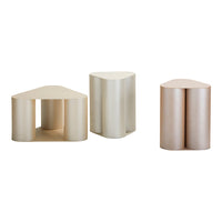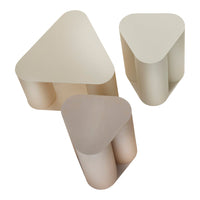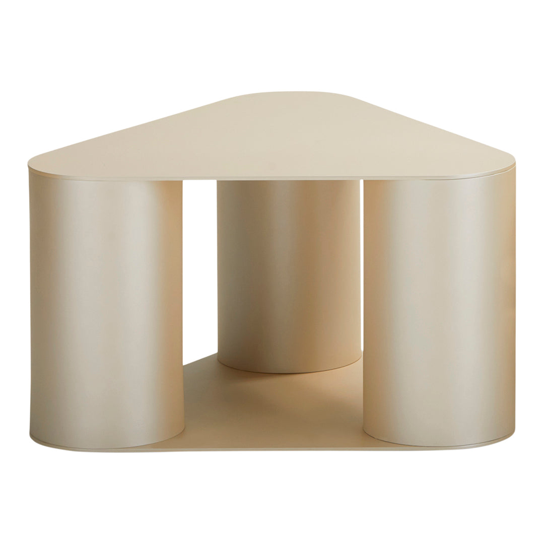 The Tres low table is the first project designed by Mut Design, creative duo from Valencia, for Saba. The collection is characterized by two triangular surfaces with rounded edges, distanced by three supporting cylinders. The sculptural volumes, available in two dimensions, acquire lightness thanks to the special iridescent finishes that recall the mother-of-pearl of shells.