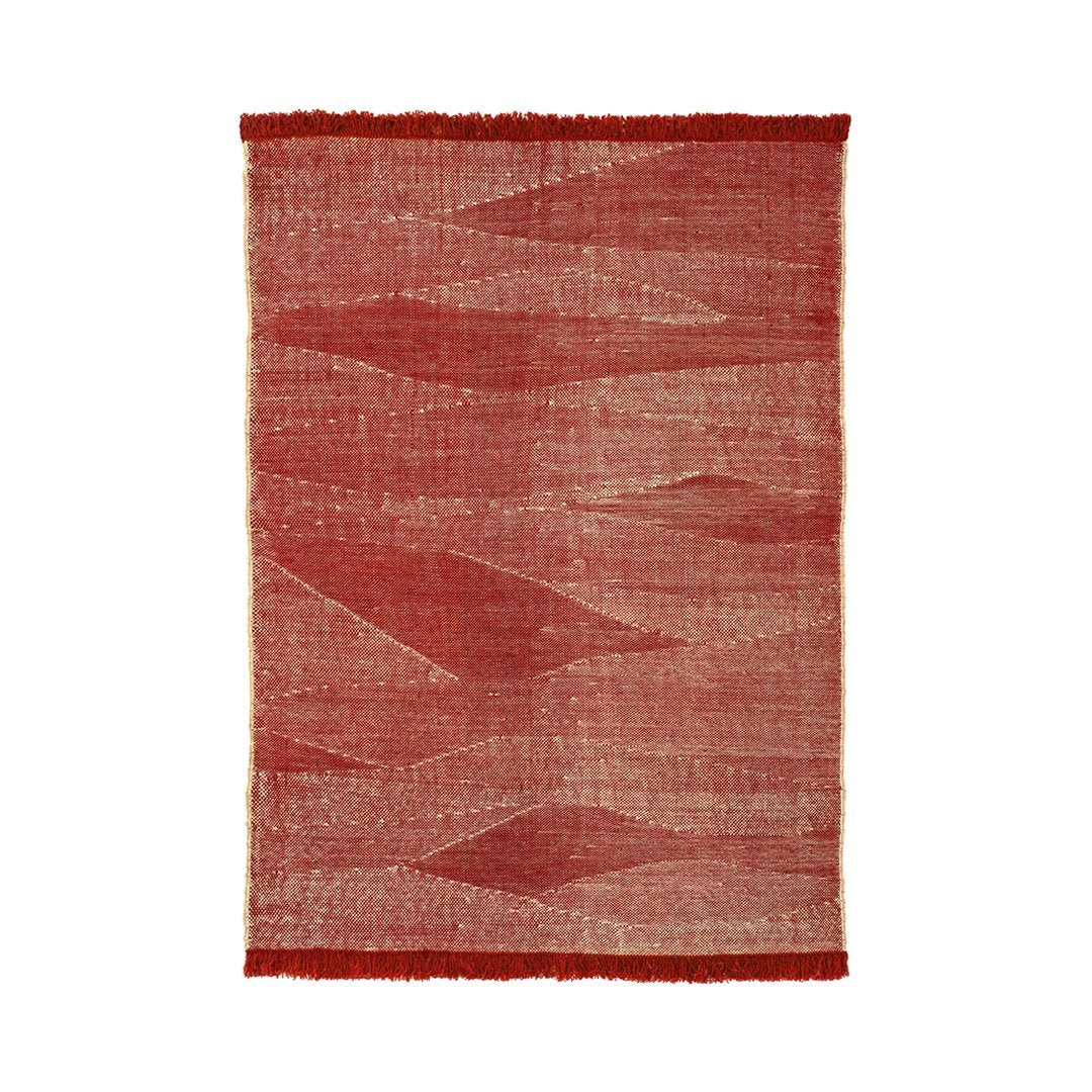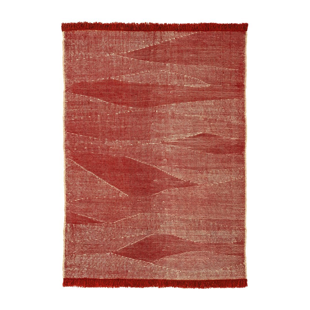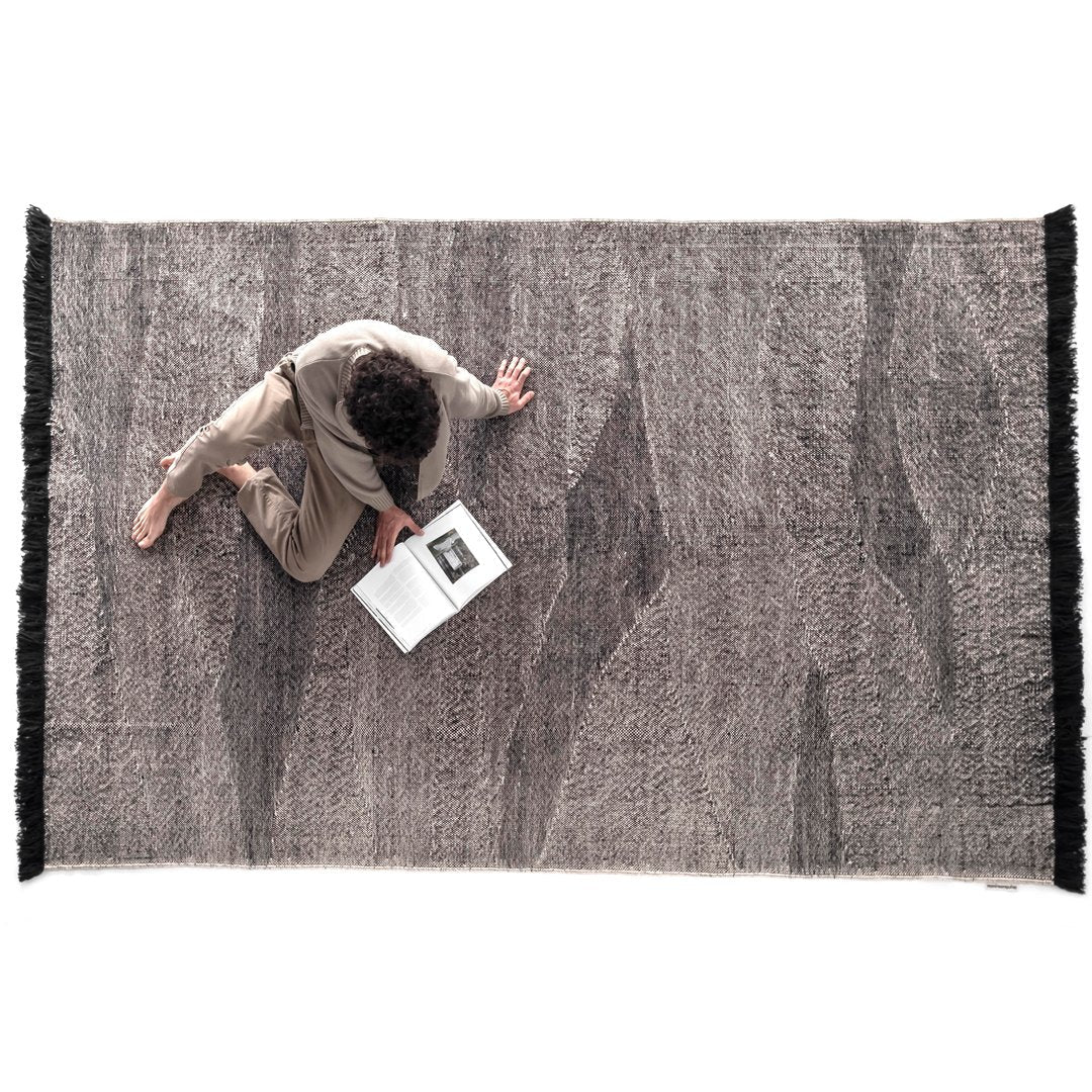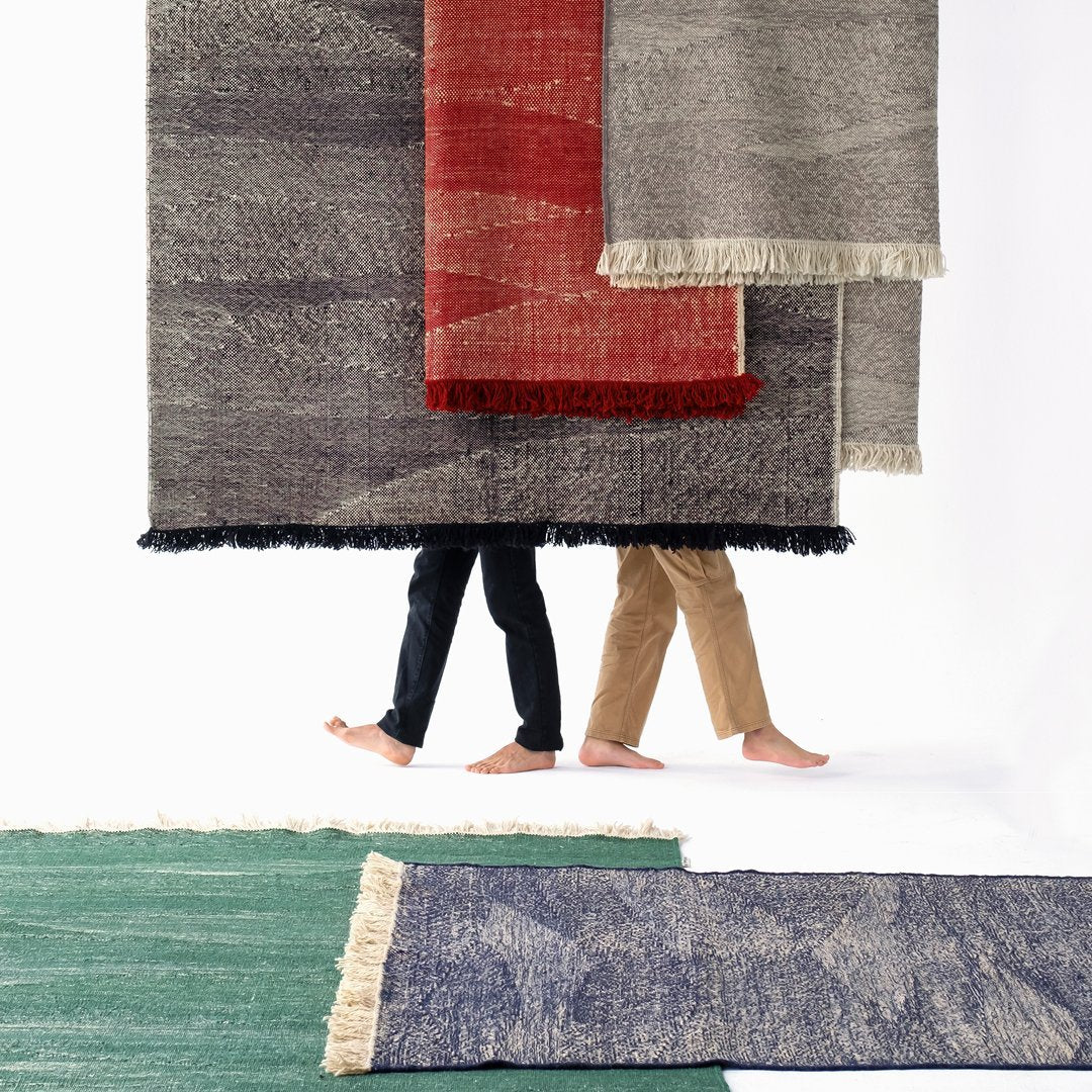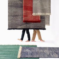 By combining the techniques used in kilims and typical dhurries, we have created a unique set of textures and rhythm through the variation and pressure of the fibers. The changes in the pattern, which are born from the tension applied between weft and warp, give the rug an appearance full of nuances, thus evoking the most primary manual work: the insistent trial and error process of the craftsman from which magical results arise.