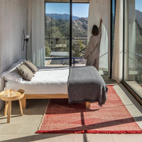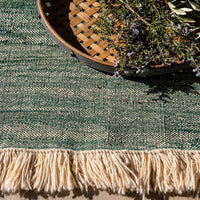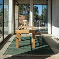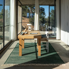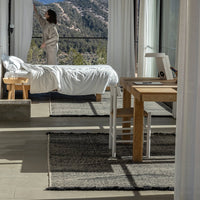 Telares has required a lot of groundwork and prototyping to find the desired texture. The result is a looser kilim of curved shapes, unlike traditional kilims that are usually geometric and rectilinear. It is hand-woven with Afghan wool. Its rustic appearance and the irregularities of the wool result in a unique rug where you can appreciate the beauty and authenticity of craftsmanship. Its curly fringes are noteworthy. Available in 5 colors, each model seeks a range of contrasts with the combination the characteristic natural color of the Afghan wool and a contrasted color.