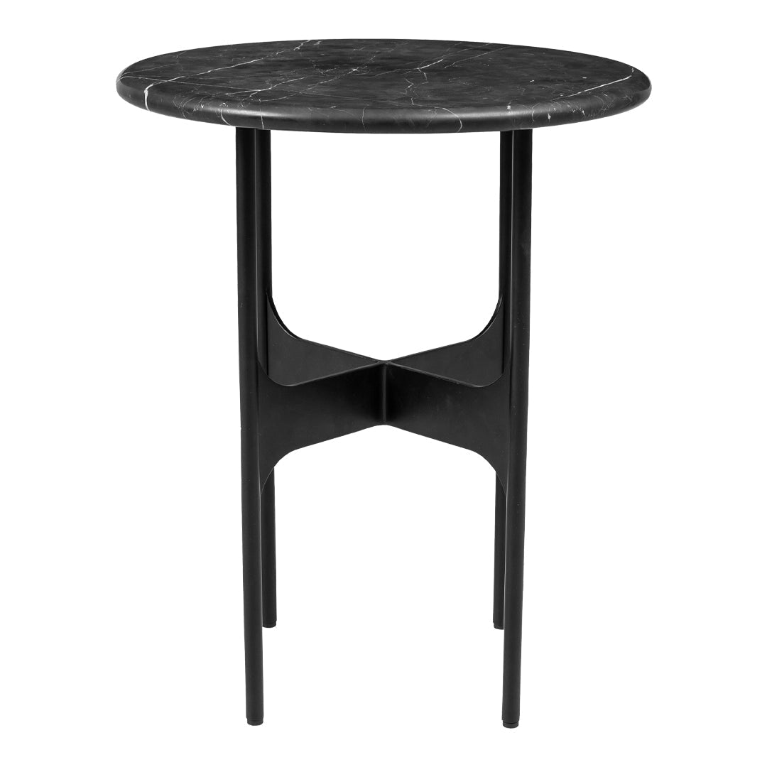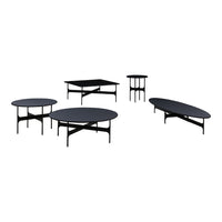 The seemingly weightless tabletop appears to float above its delicate black powder-coated steel frame, creating a visual tension that belies the table's exceptional stability. This careful balance between substance and lightness makes the Floema an ideal complement to both structured and organic seating arrangements.