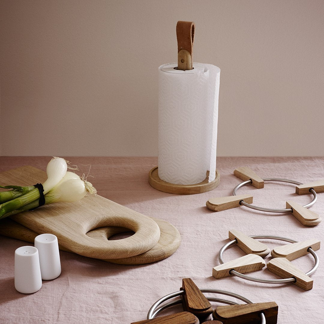 Ditte Buus Nielsen's paper towel holder in wood, leather and metal studs has a Nordic design expression. The edge at the base keeps the paper from unravelling, and the leather strap is both charming and practical, making it easy to move the holder.
