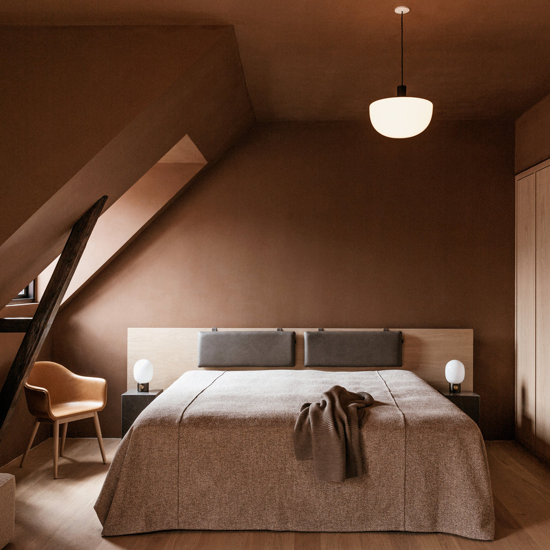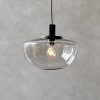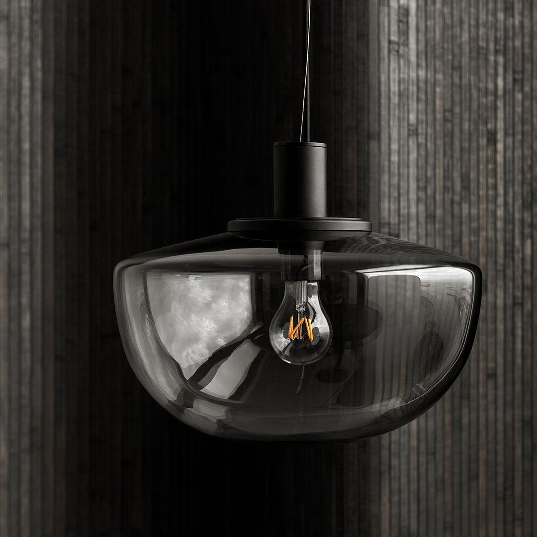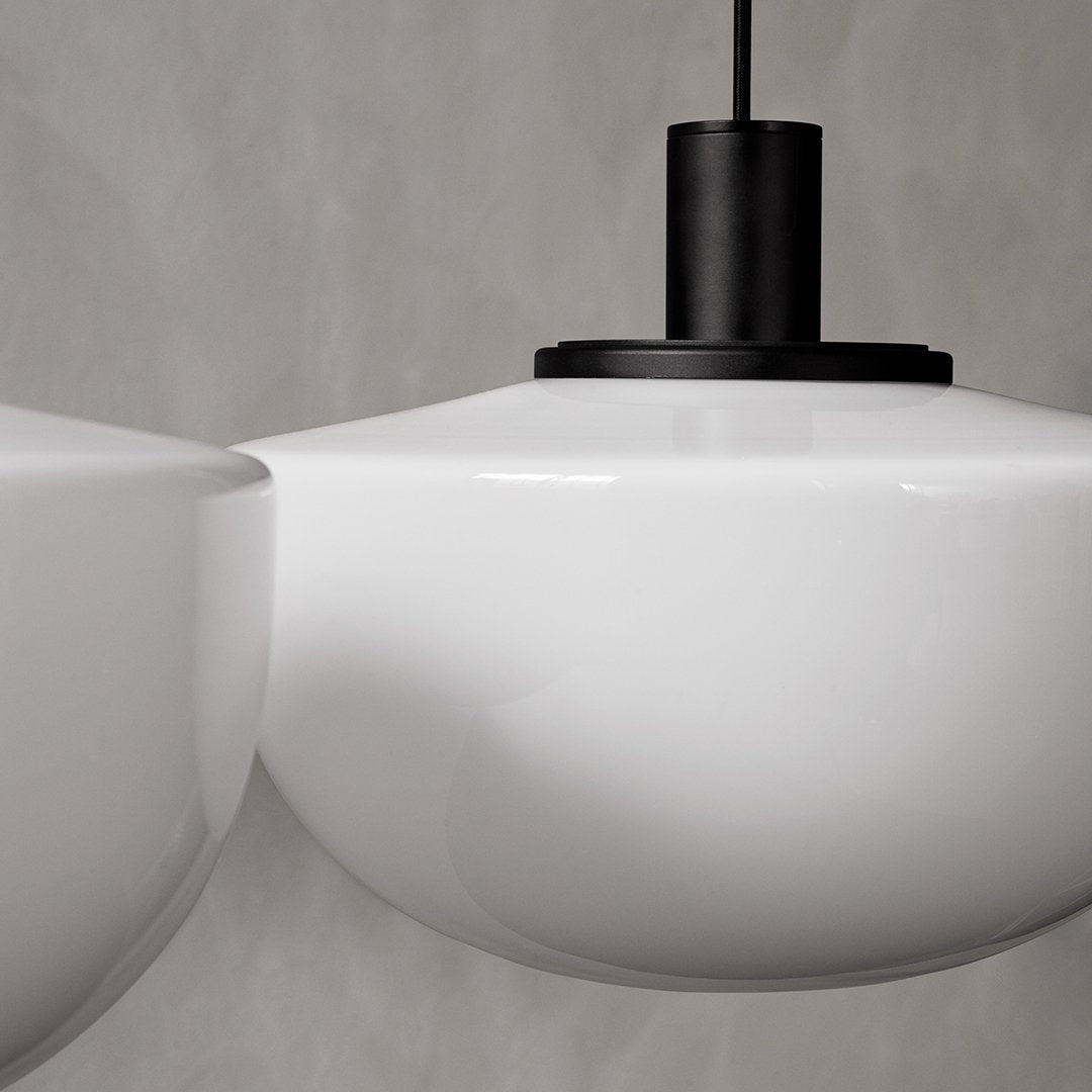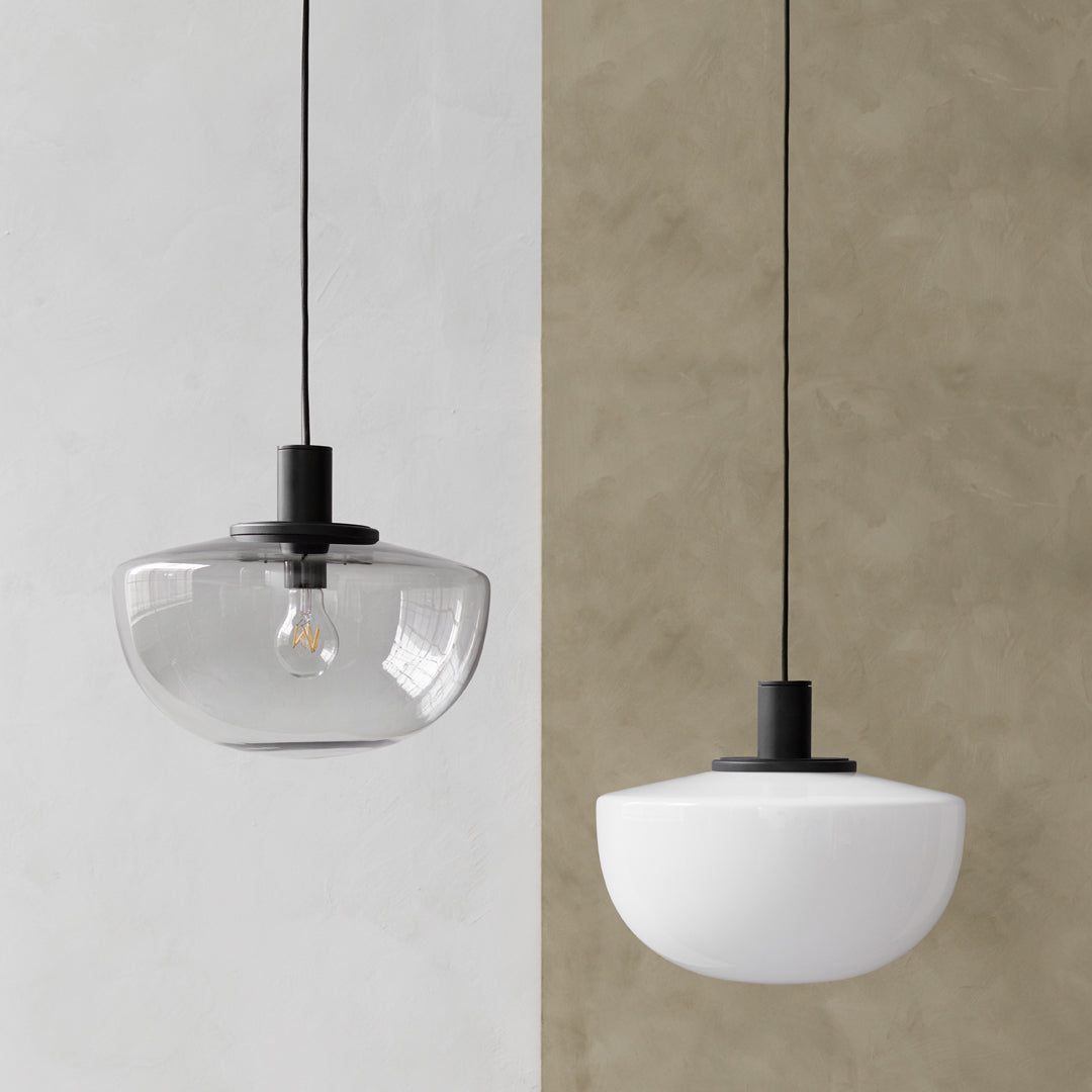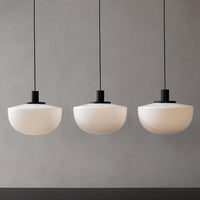 The Bank Pendant is an indoor, semicircular pendant crafted from opal or smoke mouth-blown glass and black powder-coated aluminum fittings. The opaque glass gently diffuses 360-degree light from any E26 bulb, creating ambience and providing excellent task lighting. The pairing of opaque glass and fine metal lends the product enduring quality, tactility and longevity. A special fitting with a wire ensures that the unique glass shade can easily be adjusted to hang evenly.