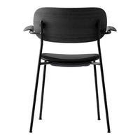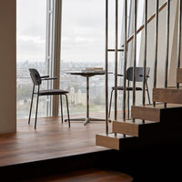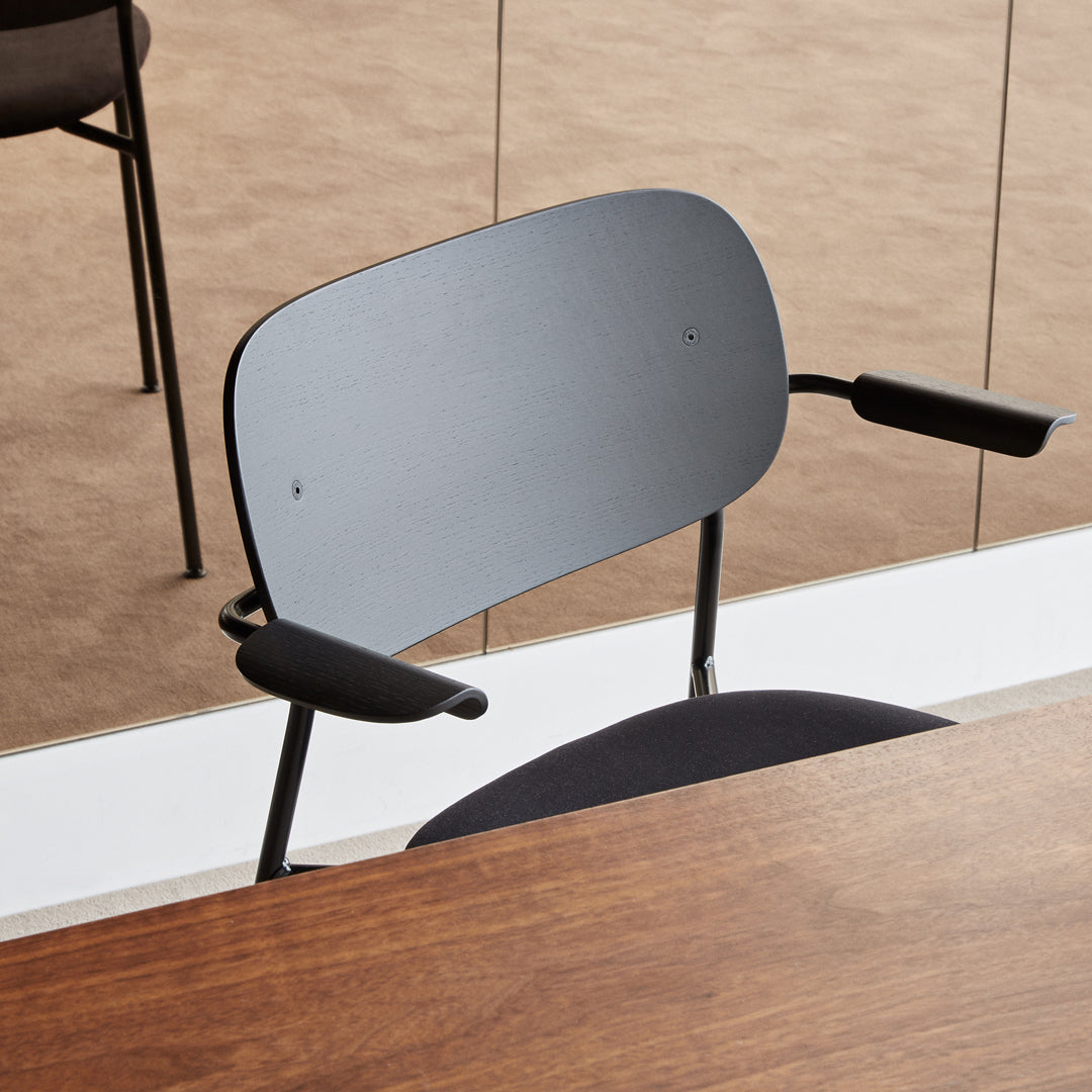 The chair is distinguished by a wide veneer back, whose proportions allow freedom of movement and provide maximum comfort. Comfort also led the design of the backrest, which is positioned and angled for exceptional support. The Co Chair's slender yet robust powder-coated steel frame defines the intriguing geometric silhouette, and delivers high durability. Optional veneer armrests adding another aesthetic and functional dimension, serving both for added comfort and for suspending the chair off the floor for easy cleaning.