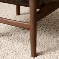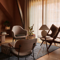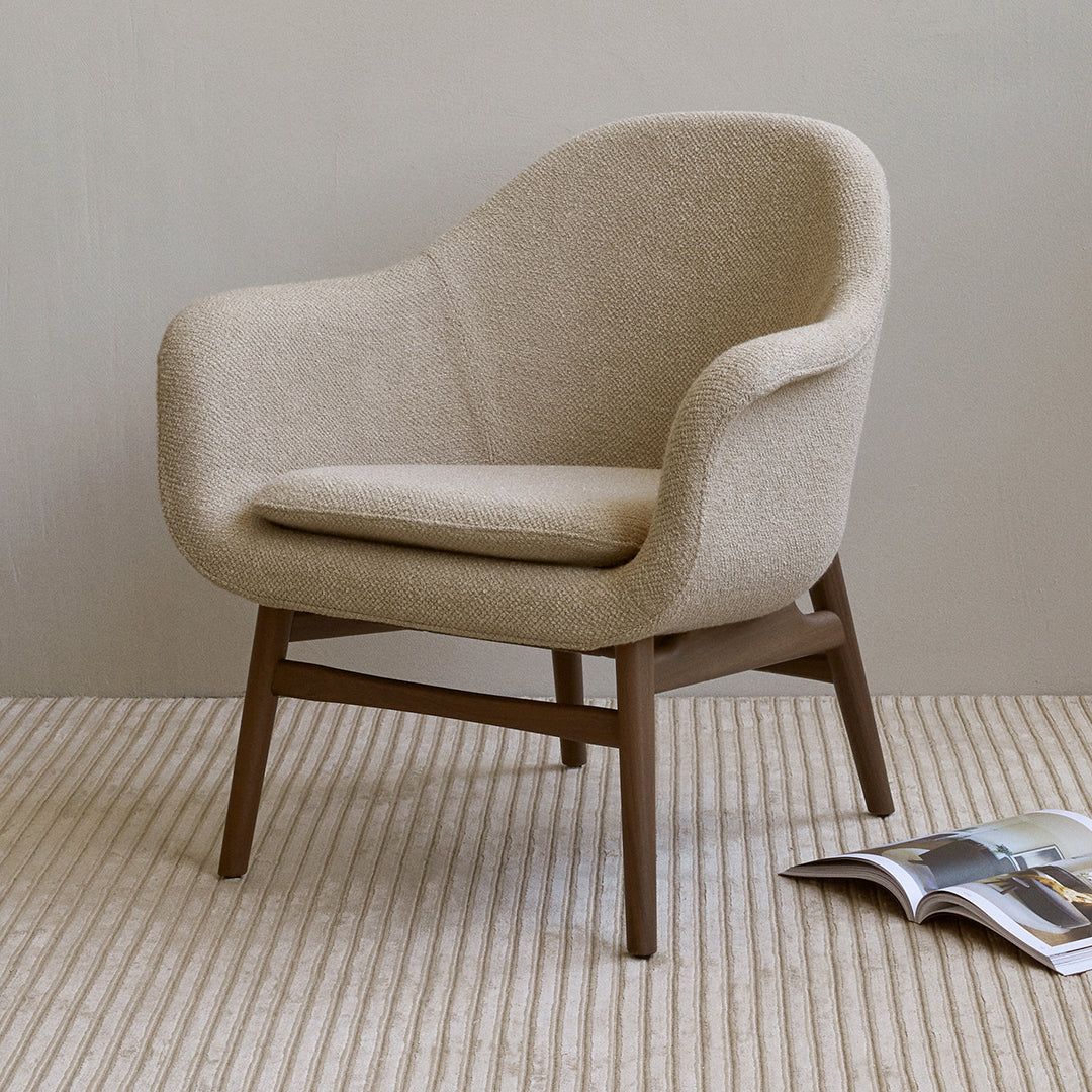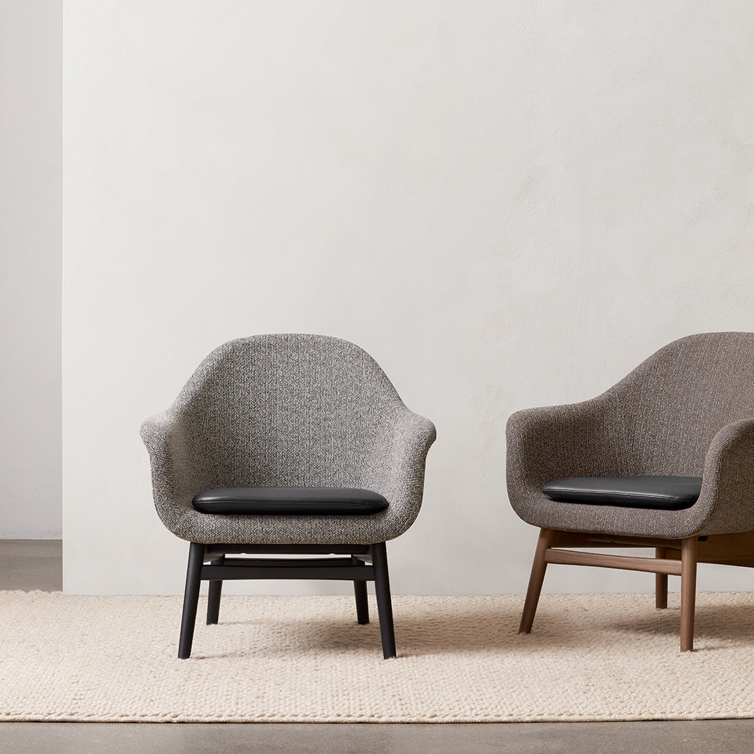 Bridging the gap between an armchair and a lounger, the new Harbour Lounge Chair has the same minimalist expression as its predecessors. Resting on a solid wood frame, offered in natural, dark stained or black oak and walnut, its embracing shell is upholstered in a range of tactile yet durable fabrics in contemporary colorways. The low-pitched frame features rounded legs and subtle joinery details, and the generous shell has a wide back, angled for comfort and supporting the body while providing space to relax. Ideal for relaxing into after a long day, it features the series' characteristic curving armrests and a luxuriously oversized seat complete with a corresponding cushion.