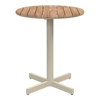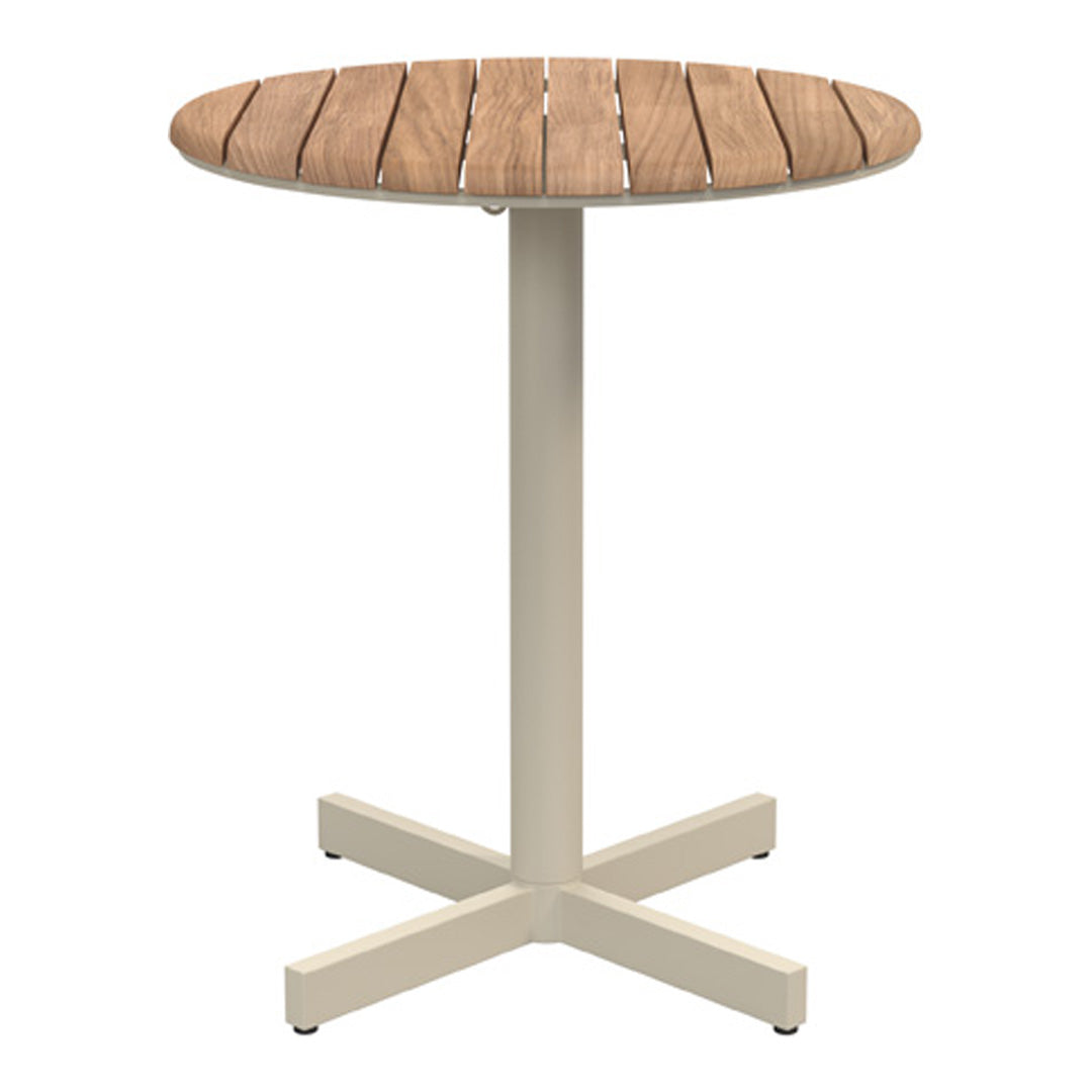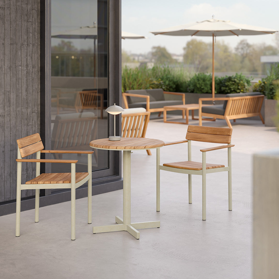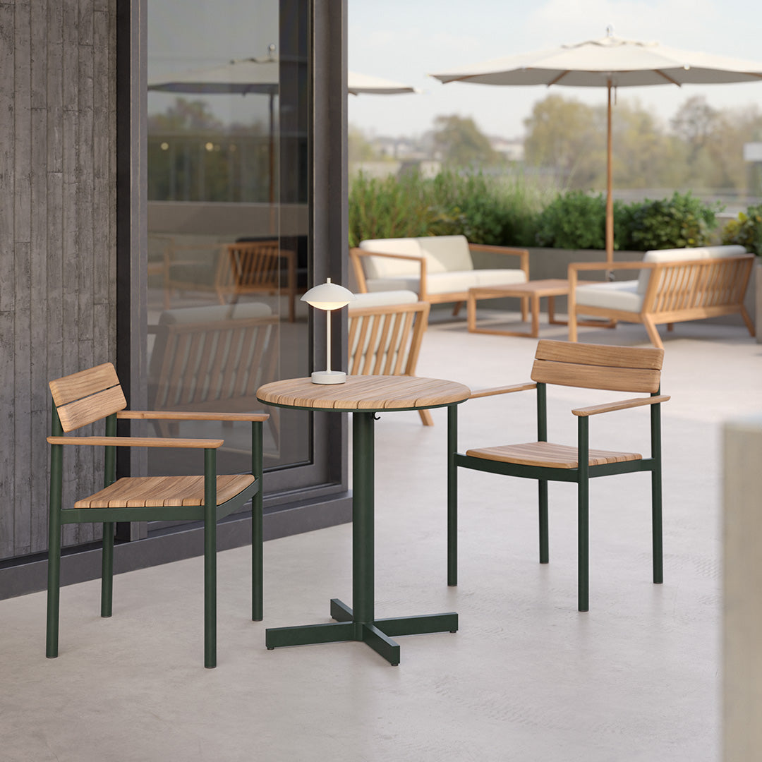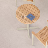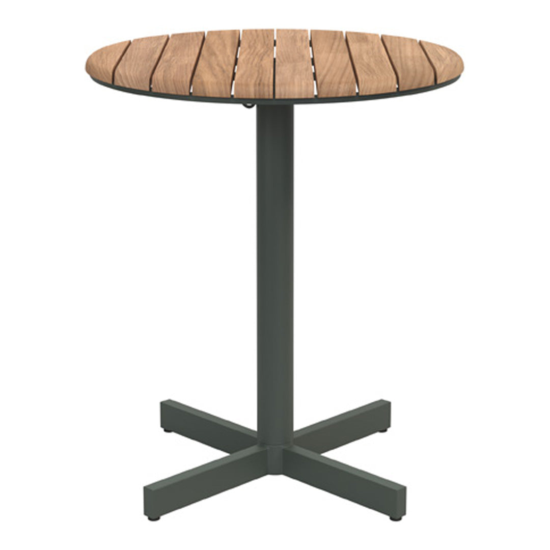 A round table with a centre-based frame and wooden tabletop. The design follows the simplicity in the Pelagus series with combination of teak and powder-coated metal. br> br>Pelagus is high on comfort and versatility. Dining and lounge furniture for a summer house in the Swedish archipelago, a villa beside a lake in Italy or grouped on the terrace of an urban hotel in California. br> br>NOTE Design Studio is a multi-disciplinary studio based in Stockholm with a holistic approach to product design, always imagining the furniture in its architectural and spatial context. Its team of architects, industrial and spatial designers love to collaborate with likeminded passionate people and companies worldwide, who dream as large as they do.