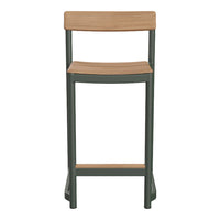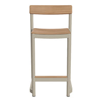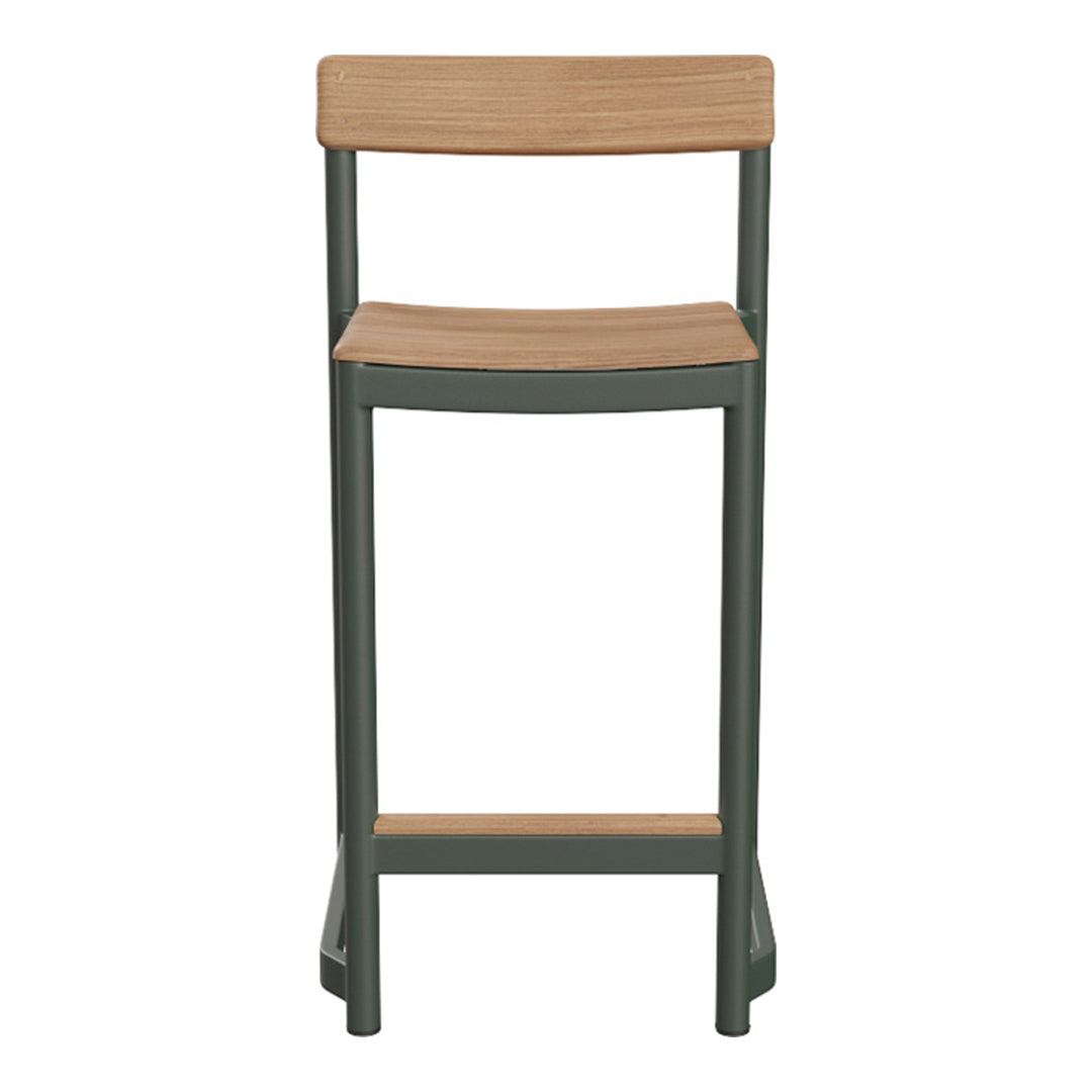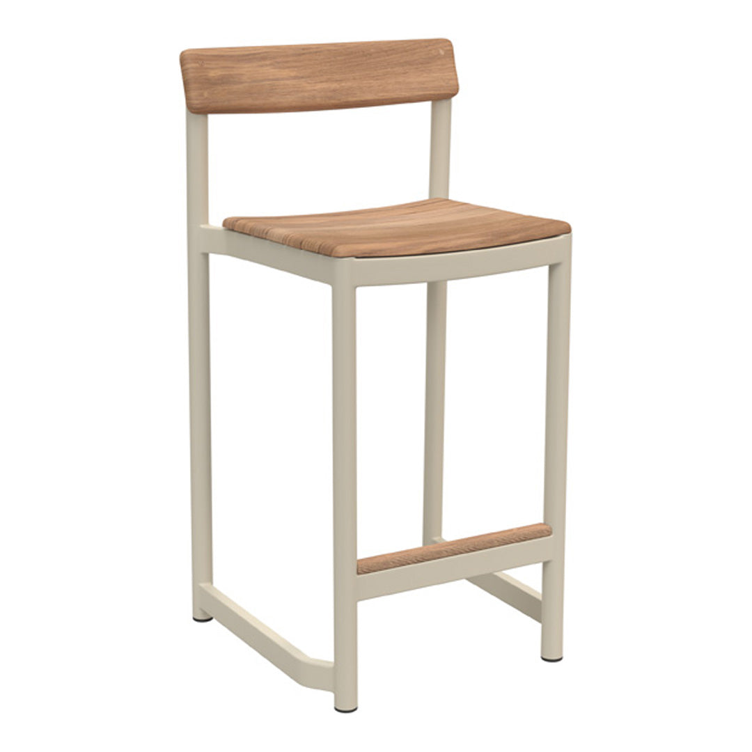 The Pelagus Counter Stool design is based on the Pelagus chair. The seat and backrest are slightly smaller, so they are not too heavy looking. There is a teak footrest in front, and it is stackable.