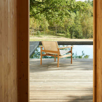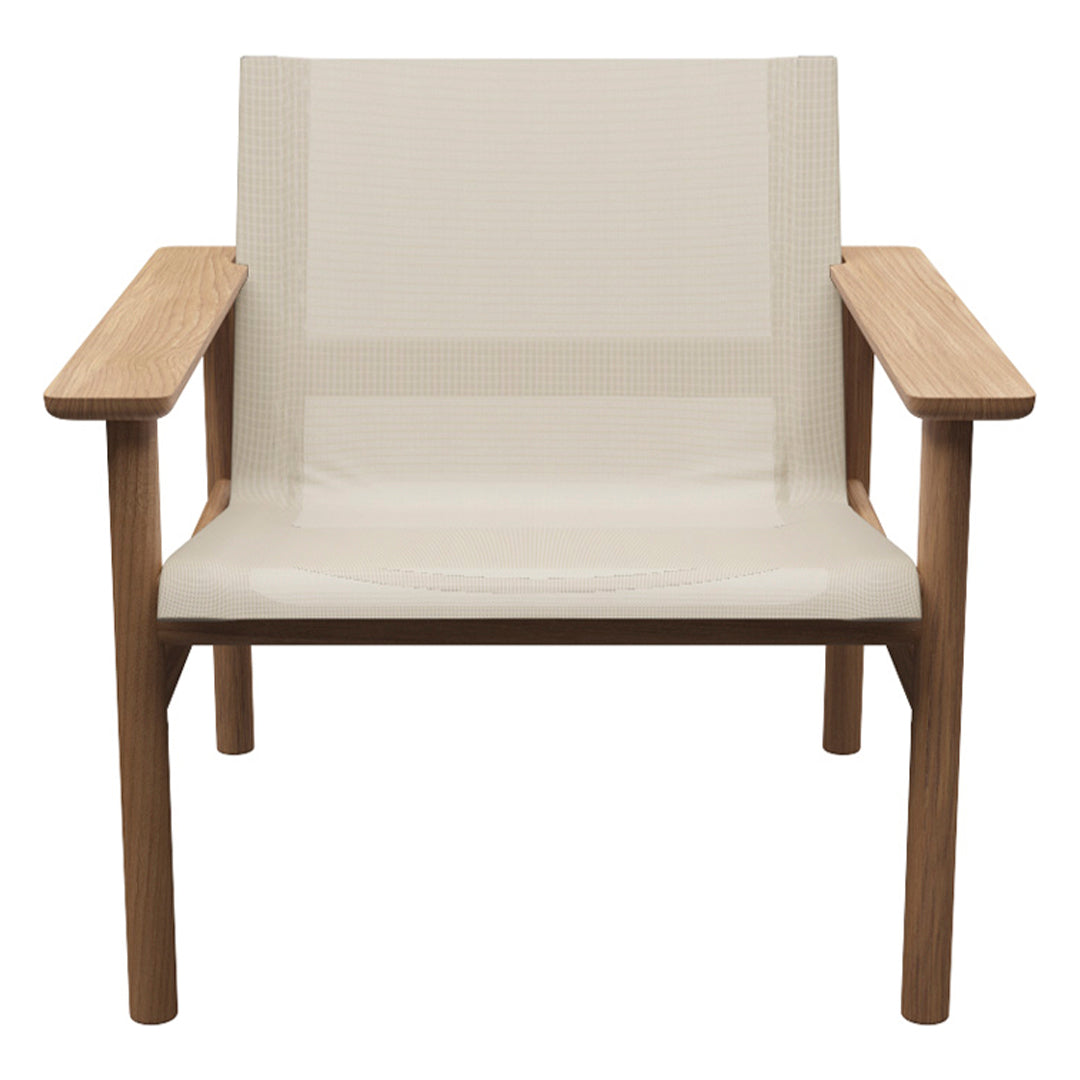 At home on a leafy porch or by the pool on a hotel terrace, the Pelagus lounge chair has a solid teak frame that evokes a classic Scandinavian typology while the weatherproof Sling fabric seat brings a modern edge with its lightness and transparency. The angle of the seat is perfectly reclined for whiling away the hours and the wooden armrests are wide enough for a drink or a book.