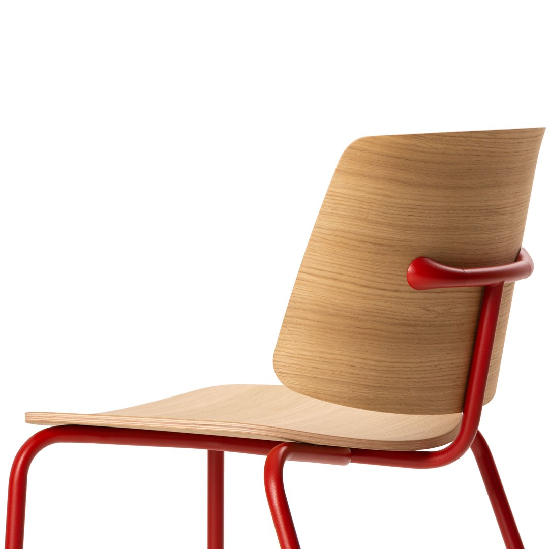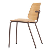 In fact it is precisely on the T-shaped support of the backrest that we have focused our attention on. At the root of the concept is clearly the recovery of a classic style, typical of the '50s and '60s design. The two wooden shells joined by the metal frame are an image that each of us has in our memory, from everyday examples such as school chairs or Nordic bistro chairs to Eames' immortal masterpieces.