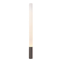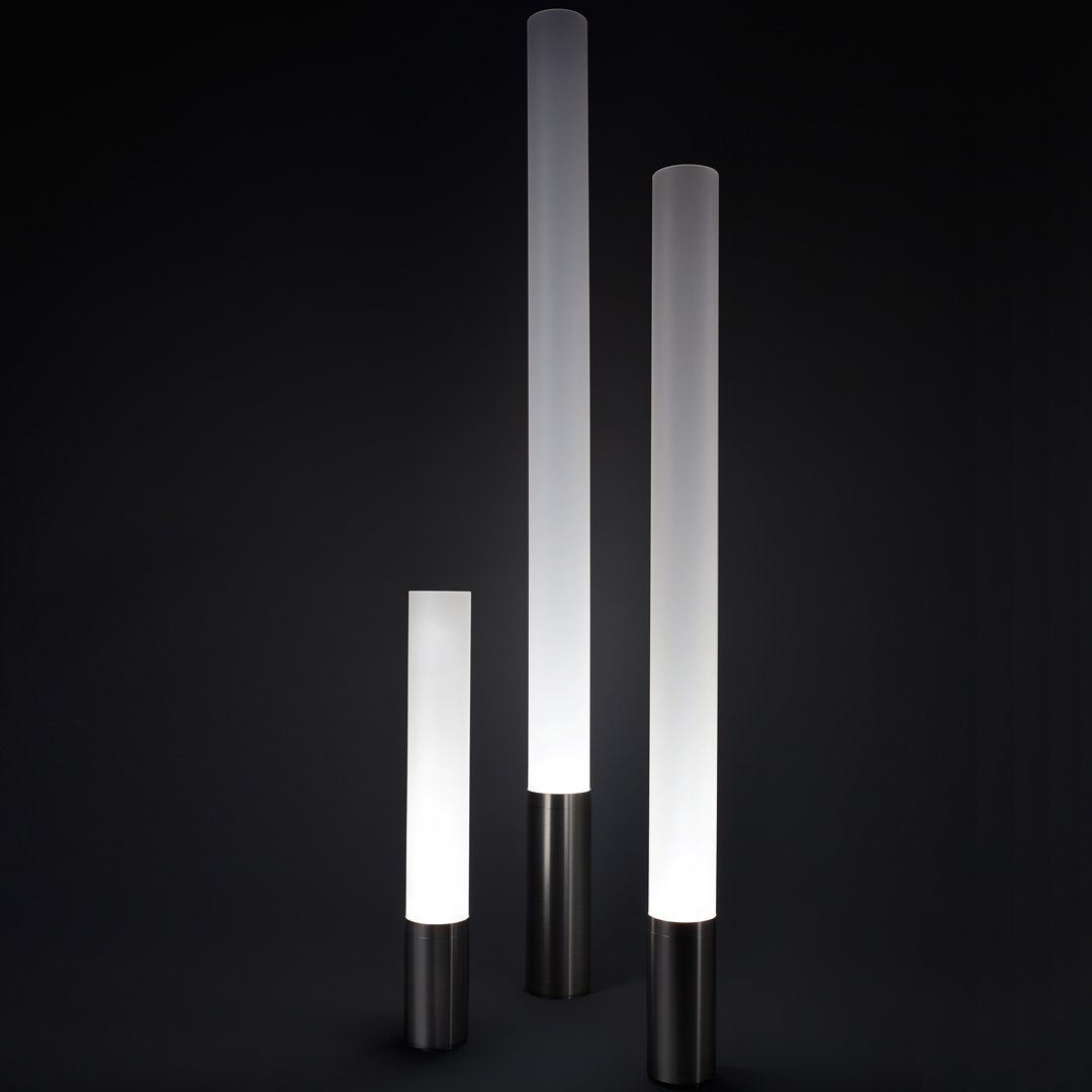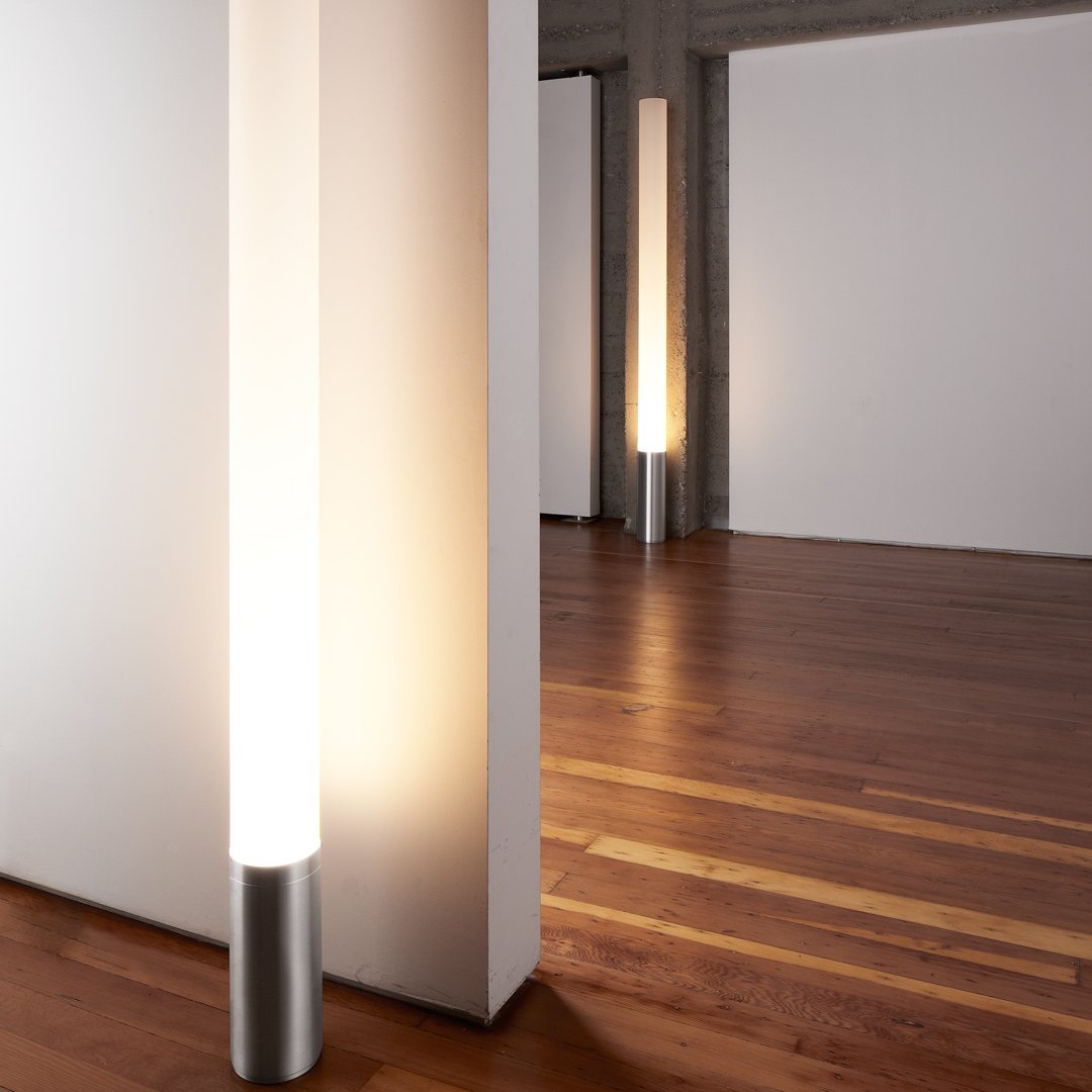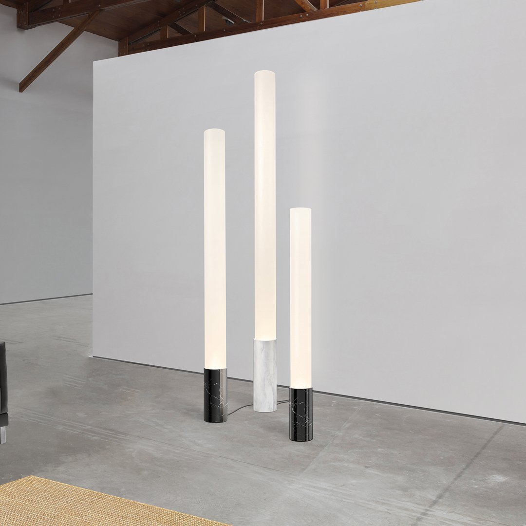 Elise is a conceptual tribute to the machine age: streamlined, understated, and honest in its function as a light source. Celebrating the most classic of industrial forms, the cylinder, two elements compose the lamp: a refined aluminum base or a new polished marble base conceals the light source, providing ample ballast, while its towering frosted acrylic diffuser becomes a beacon of light. Its confident, geometric simplicity enables it to comfortably inhabit a diversity of spaces. Elise offers a full dimming range and is available in heights ranging from 12" to 80".