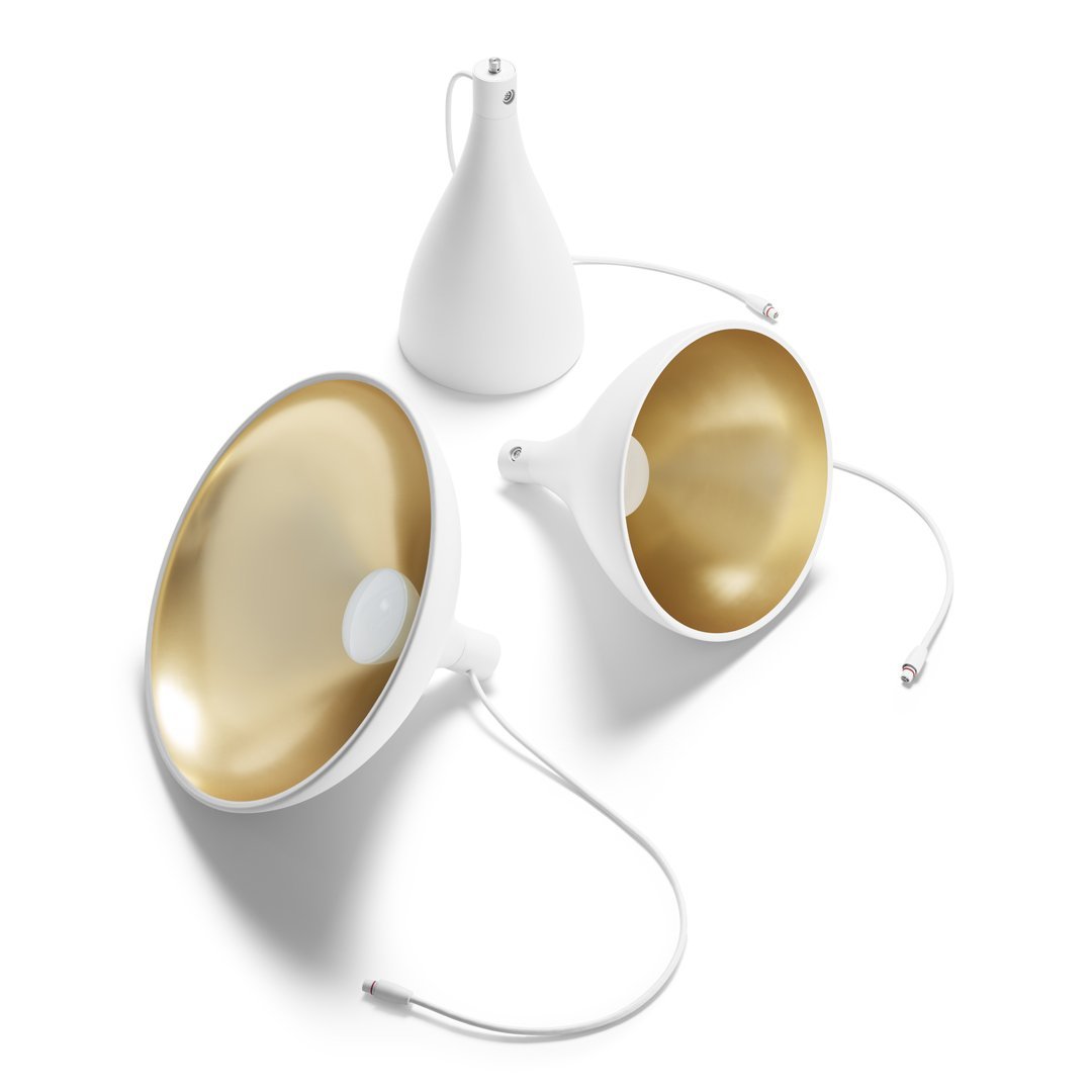 Elegant and infinitely flexible, Swell is a modular LED lighting system designed to seamlessly blend the line between indoor and outdoor lighting. Formed from spun aluminum, Swell's 3 shade designs pair fluid, undulating lines with a radiant brass interior and can be mixed and matched to create dynamic groupings. Swell can be suspended individually, as a chandelier or as inter-connectable shade strings to perfectly complement residential, commercial, lounge and hospitality settings alike.