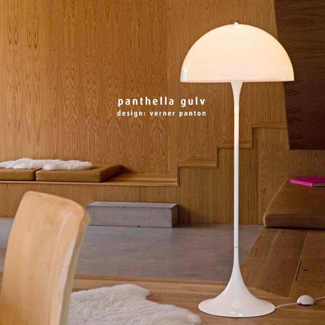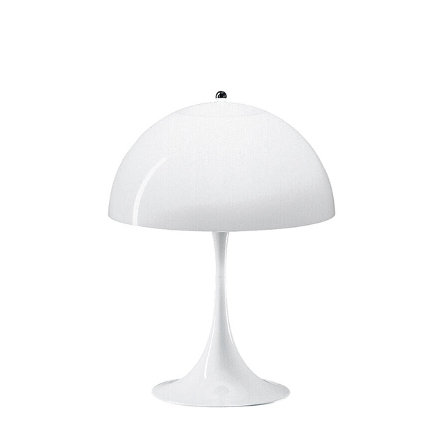 Created in 1971, Verner Panton's Panthella is one of his more popular designs. The basic light principle aimed to create a lamp in which the base as well as the shade would act as a reflector. The lamps light source is hidden under a milky-white, hemispheric acrylic shade and a white, trumpet-like base contributes to a beautiful distribution of light and a well balanced form.