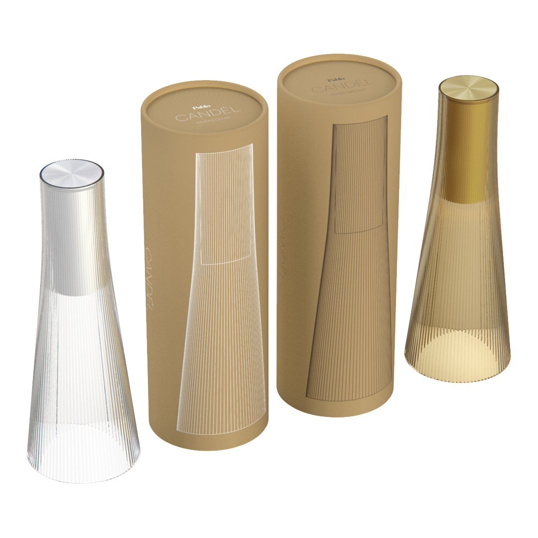 Inspired by a cone of light, Candel’s graceful vessel like silhouette is in perfect harmony with its surroundings allowing the environment to filter through. Candel casts a warm, intimate candle like glow that’s sure to seduce and become the central focus of any social gathering. Candel is a fully rechargeable portable LED light designed for both indoors and outdoors. Features a robust PMMA body in Clear or Bronze tint combined with a striking anodized aluminum light module that offers capacitive touch light control to provide up to 4 light levels to set the perfect ambiance. Battery life ranges from 10 to 150 hours depending on light intensity.