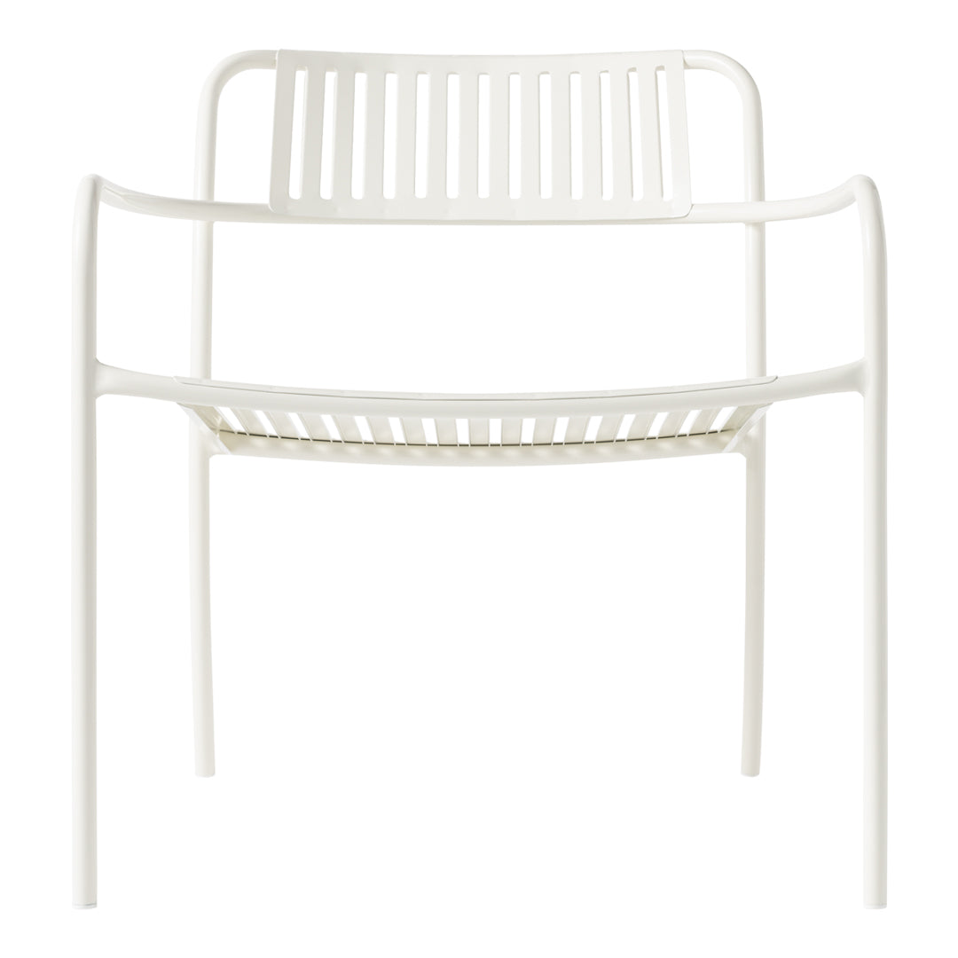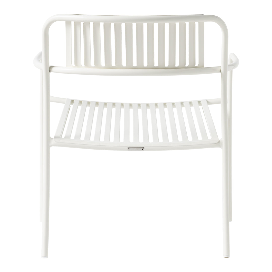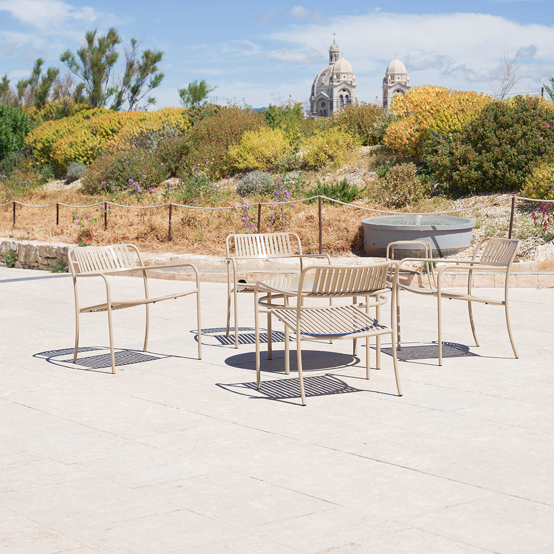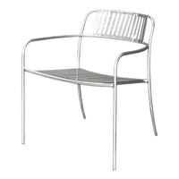 Second piece of the Patio outdoor collection, imagined by Pauline Deltour in 2019, this armchair invites to idleness and relaxation. On very fine tubes, a seat pre-cut with laser is composed of perforated slats that add delicacy to a robust and durable product. The use of stainless steel for this product gives it both unparalleled longevity and, through a folding mechanism under the seat, a resistance while being lightweight due to the composition of this alloy. Note the unique curved tube that connects the front legs and the backrest, respecting the hand of the artist gliding on his drawing sheet without interruption. An enjoyable armchair, a worthy heir to the craftsmanship of Tolix, which, when combined with the Patio ottoman, will delight anyone seeking comfort, relaxation, and leisure.