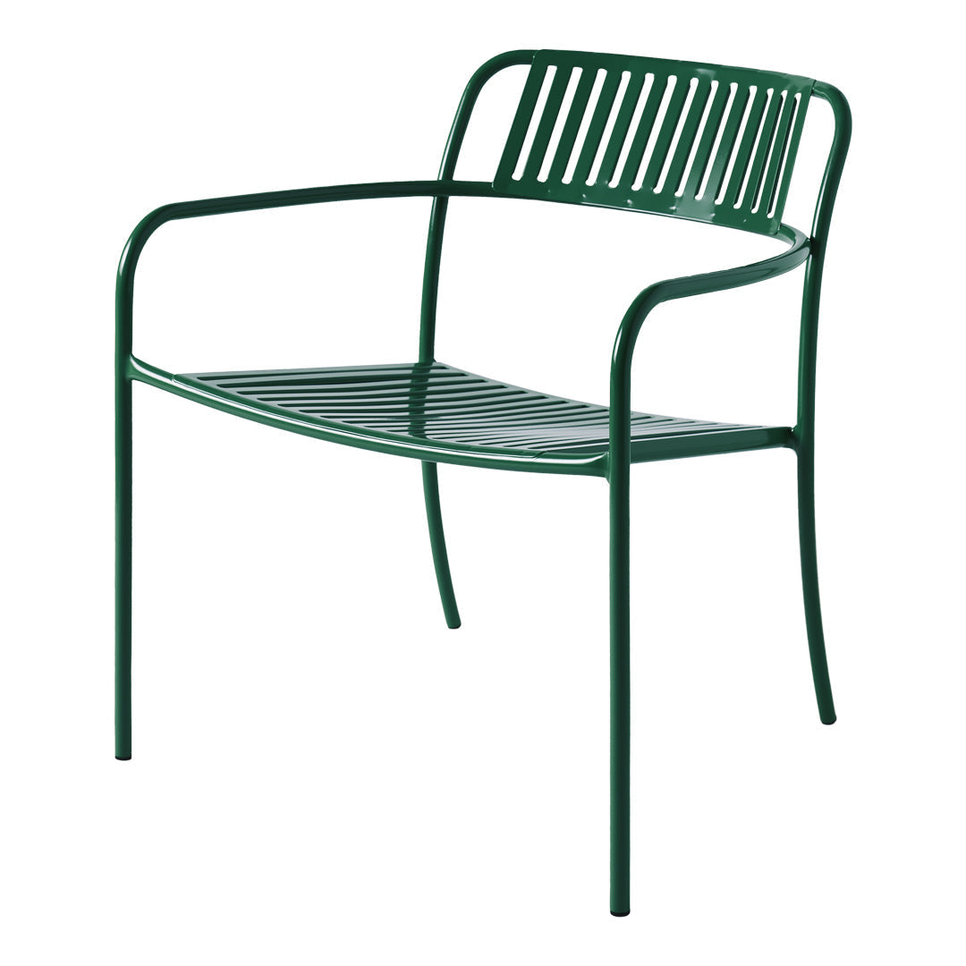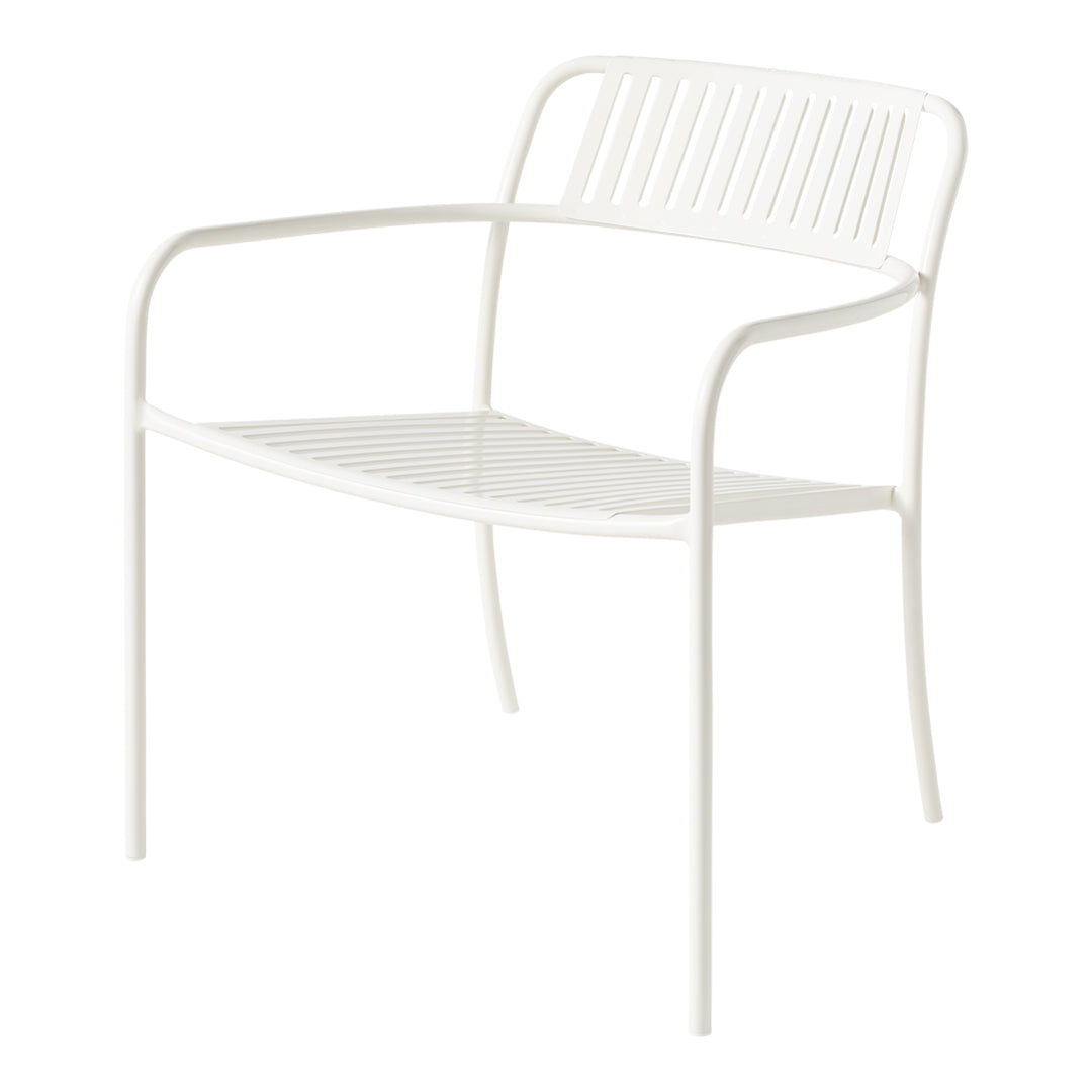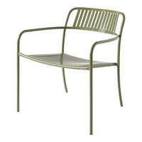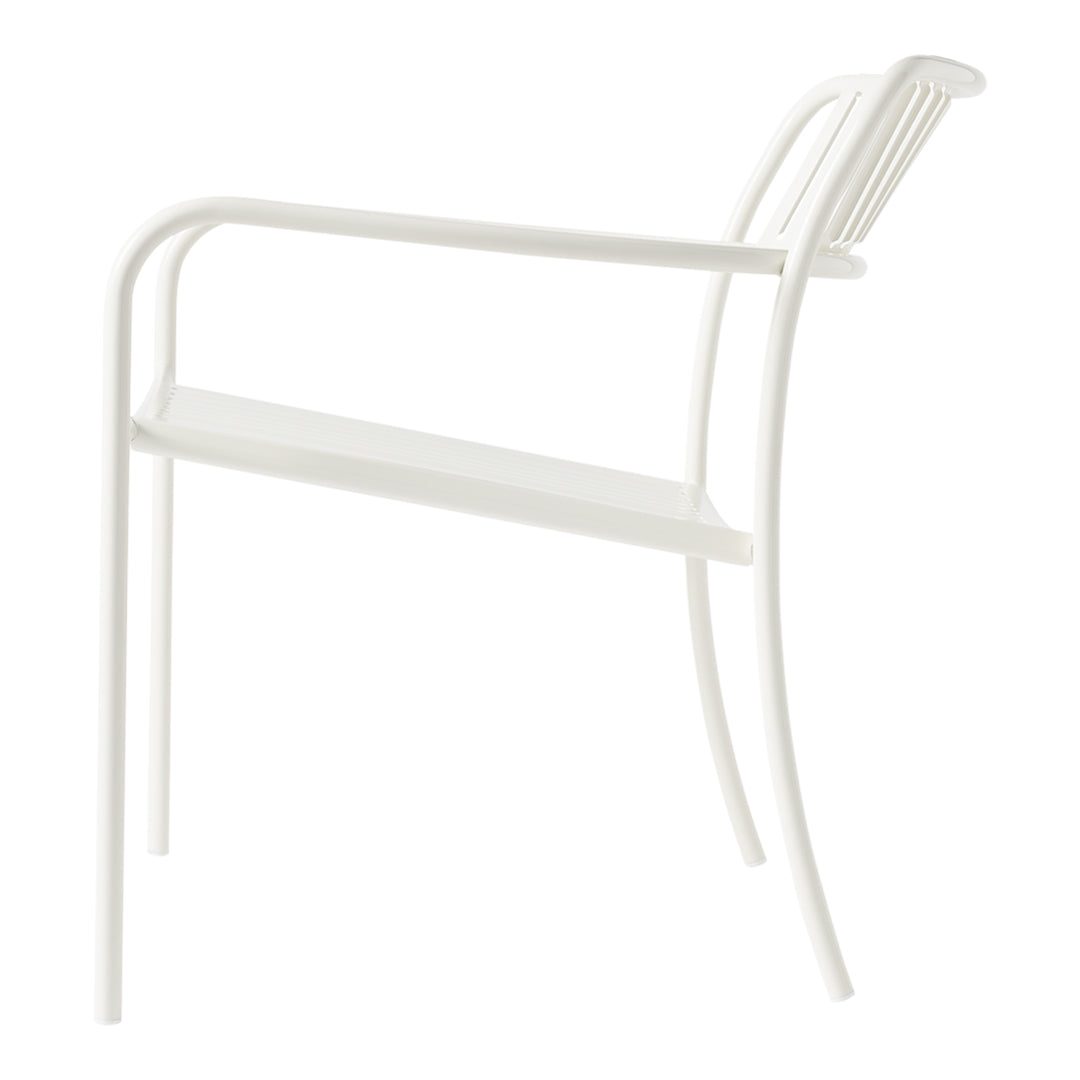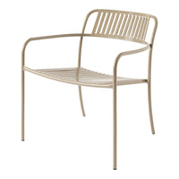 Second piece of the Patio outdoor collection, imagined by Pauline Deltour in 2019, this armchair invites to idleness and relaxation. On very fine tubes, a seat pre-cut with laser is composed of perforated slats that add delicacy to a robust and durable product. The use of stainless steel for this product gives it both unparalleled longevity and, through a folding mechanism under the seat, a resistance while being lightweight due to the composition of this alloy. Note the unique curved tube that connects the front legs and the backrest, respecting the hand of the artist gliding on his drawing sheet without interruption. An enjoyable armchair, a worthy heir to the craftsmanship of Tolix, which, when combined with the Patio ottoman, will delight anyone seeking comfort, relaxation, and leisure.