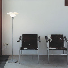 Poul Henningsen designed the three-shade system during 1925/1926. The first lights using the system were designed for an exhibition in Paris. His work with Louis Poulsen continued until his death in 1967. Throughout his life, PH sought to create glare-free lighting; aiming to direct light where it was most needed, and creating soft shadows while using incandescent bulbs as a light source. The 3 ½-2 ½ Floor light is a member of the three-shade family and is one of 19 versions available today. Approximately one thousand different models have been produced over the years and consisted of table, floor and wall lamps, as well as a number of different chandeliers, which were very popular in the 30s for lighting private homes with high ceilings. There were countless combination options. The lights were available in different colors, as well as a range of sizes. The first shades were made of metal with a painted undersurface, such as white, gold or silver depending on whether diffuse, warm or cold light was desired. Glass was later introduced for the three-shade system. In addition to the downward-directed light, glass lamps illuminated the room. PH was the first person to pursue a scientific approach to light and use the logarithmic spiral as a basis. By using a design based on the logarithmic spiral he achieved even distribution of light over the entire curve of the shade. This even light distribution, together with the diffuse reflection through the glass, made it possible to control glare and shadow. Each shade reduces the amount of light equally, due to their distance from the light source. The PH light model numbers refer to the shade size. Each top shade had a corresponding set of middle and lower shades. In the pure models, such as the 2/2, the top shade has a size of about 20 cm, with corresponding lower shades. PH 3 ½-2 ½ Floor consists of an approximately 35 cm top shade with lower shades. These hybrid models were introduced due to the desire to hang pendants at lower heights. The system was also used for floor, table and wall lamps. PH 3 ½-2 ½ Floor in its current form was introduced in 2002.