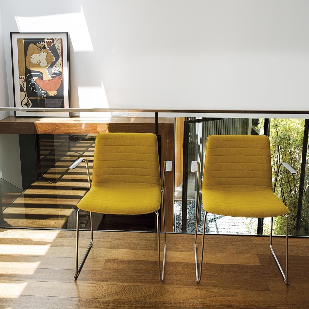 Stackable chair with a steel sled base in polished chrome finish. Thermo-polymer seat and backrest available in several colors. Optional fully upholstered shell or parallel upholstery stitching. The upholstered version includes a stacking protector.