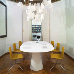Chair with four star aluminum swivel central base and self-return system in polished aluminum finish but also available in other aluminum colors. Thermo-polymer seat and backrest available in several colors. Optional fully upholstered shell or parallel upholstery stitching.