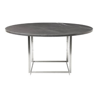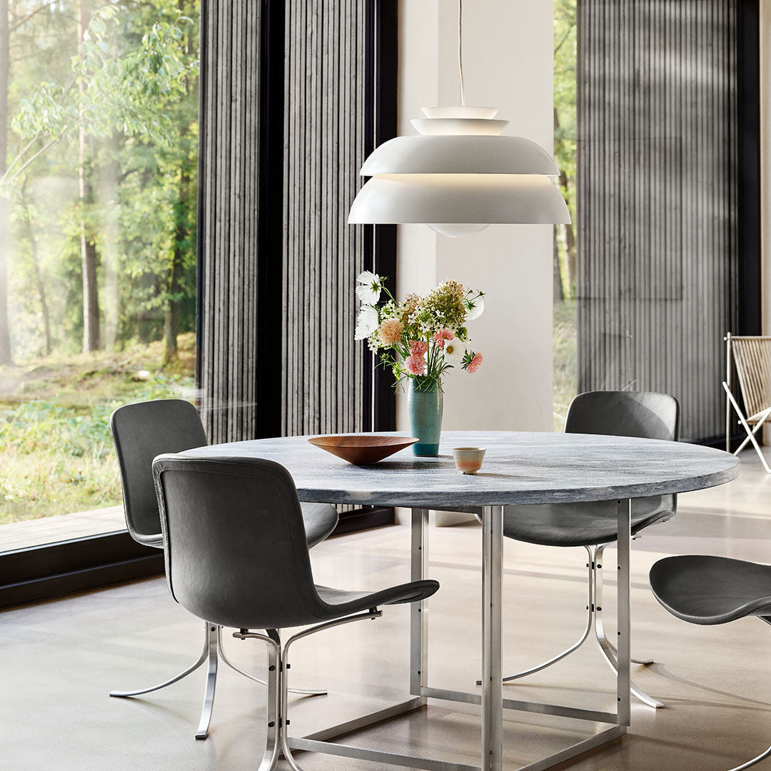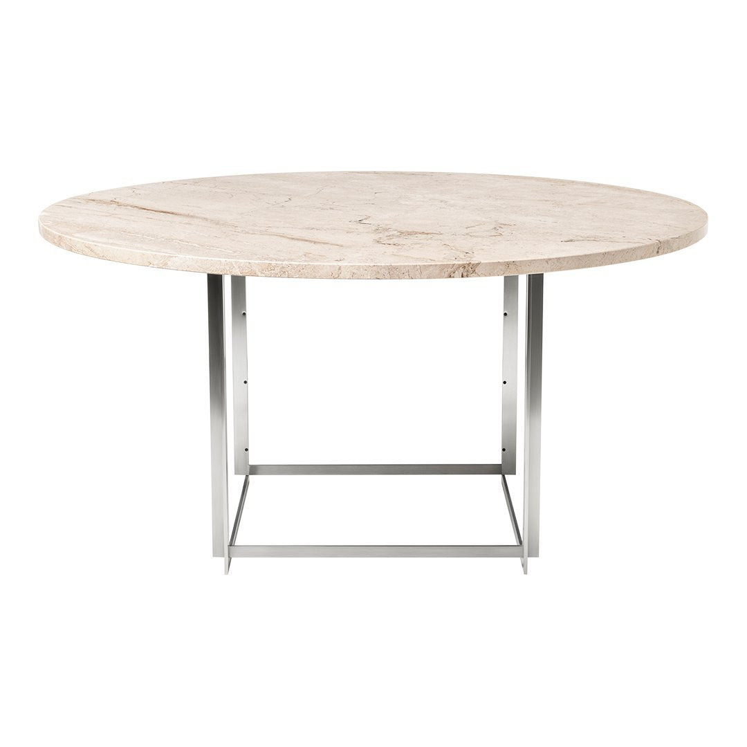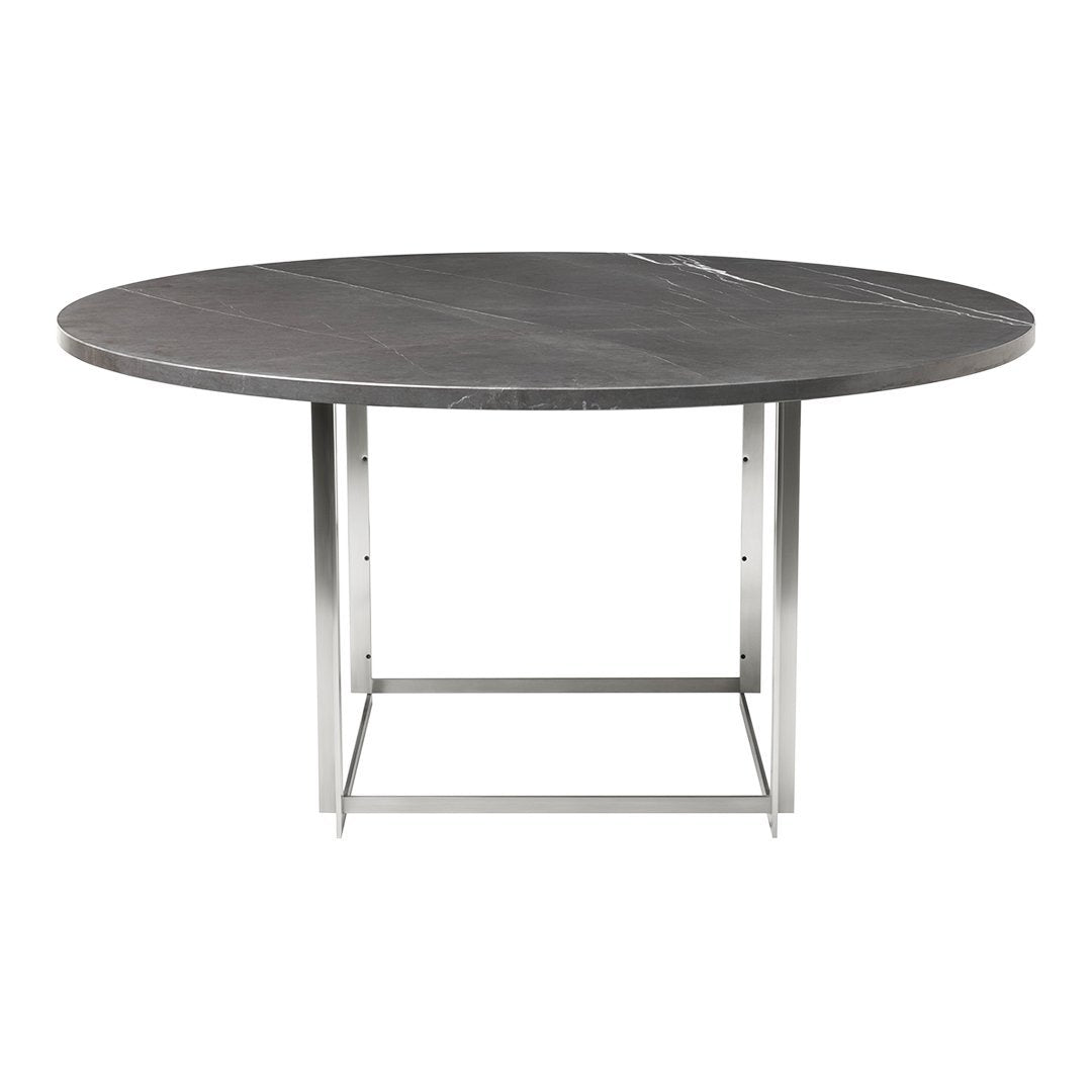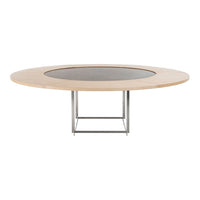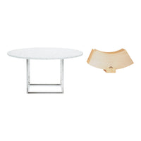 The PK54 dining table is a study in contrasting materials and forms. Circle meets square and the pure expression leaves a monumental impression that makes the table the natural focal point in any room no matter where the table is placed. One of the defining characteristics of the table are the extension ring, which provide an unusual solution to the problem of extending a round table and make the table even more unique. Stone meets wood, hard meets soft and the table completely changes expression without loosing its identity, when the concentric wooden leaves are applied to the table. The PK54 has a light steel rolled marble or granite tabletop combined with a base in satin-brushed stainless steel. An extension ring (PK54A) is available in solid maple.