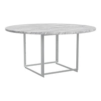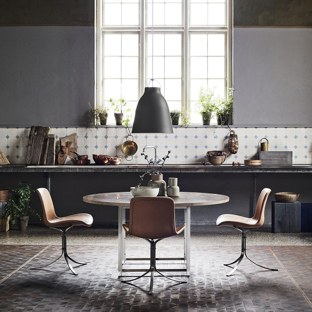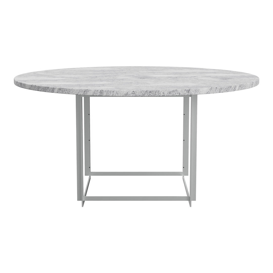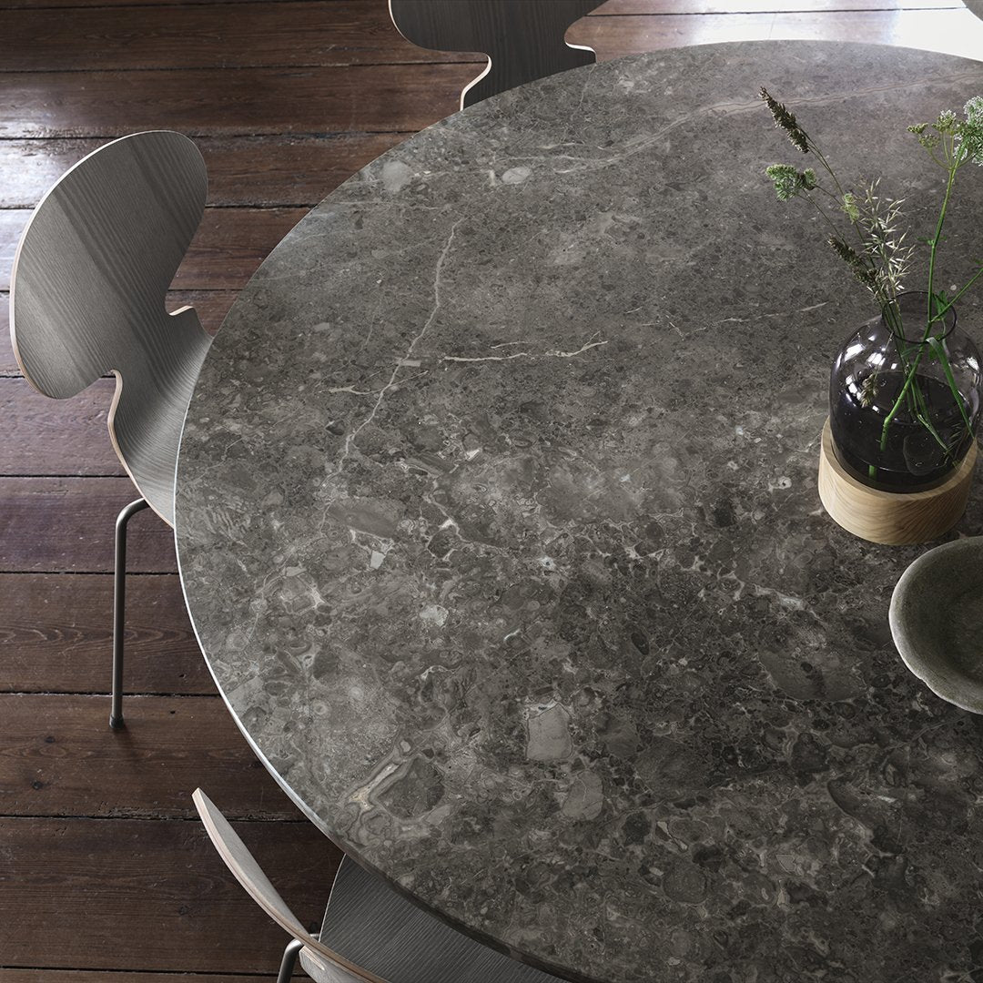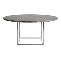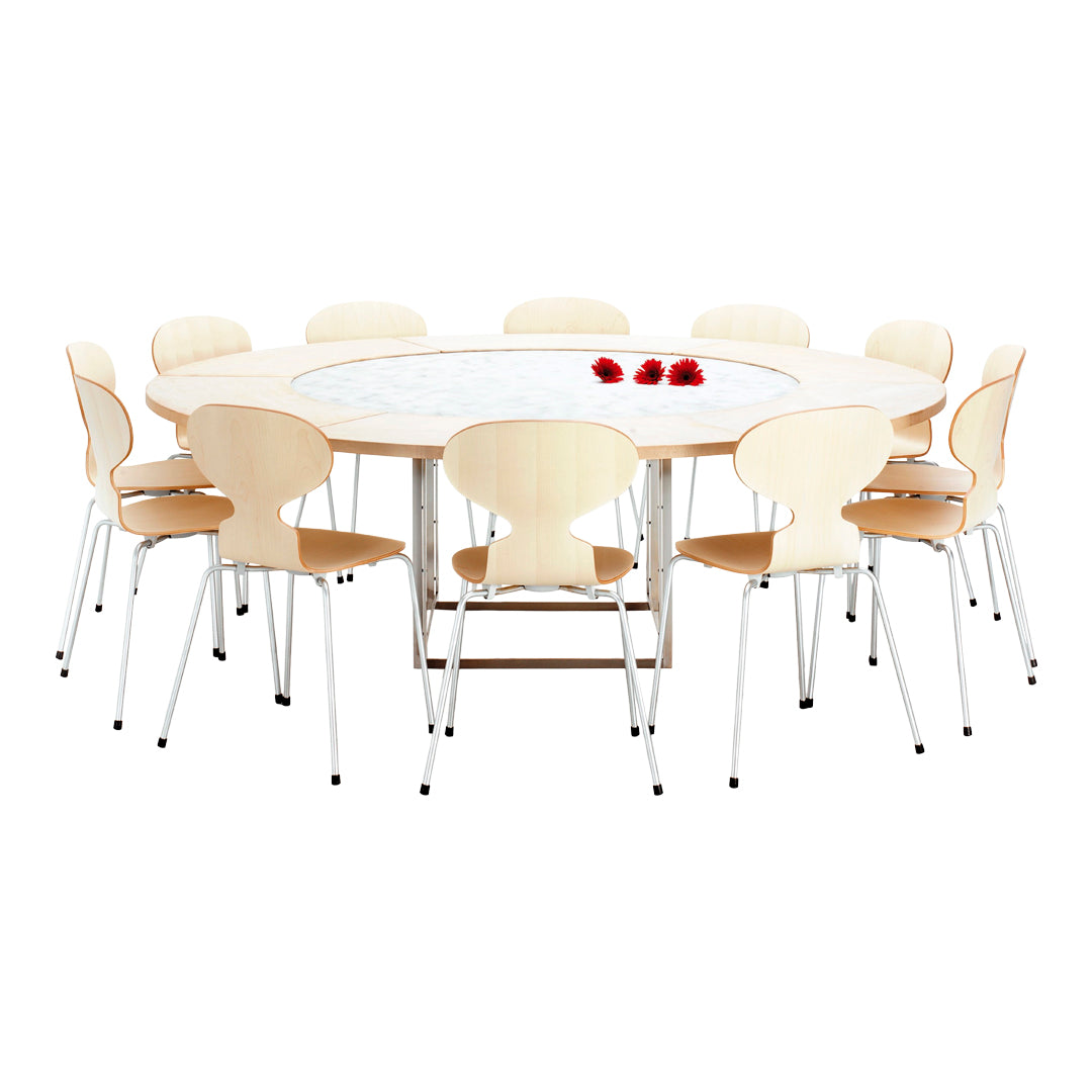 The PK54 dining table is a study in contrasting materials and forms. Circle meets square and the pure expression leaves a monumental impression that makes the table the natural focal point in any room no matter where the table is placed. One of the defining characteristics of the table are the extension ring, which provide an unusual solution to the problem of extending a round table and make the table even more unique. Stone meets wood, hard meets soft and the table completely changes expression without loosing its identity, when the concentric wooden leaves are applied to the table. The PK54 has a light steel rolled marble or granite tabletop combined with a base in satin-brushed stainless steel. An extension ring (PK54A) is available in solid maple.