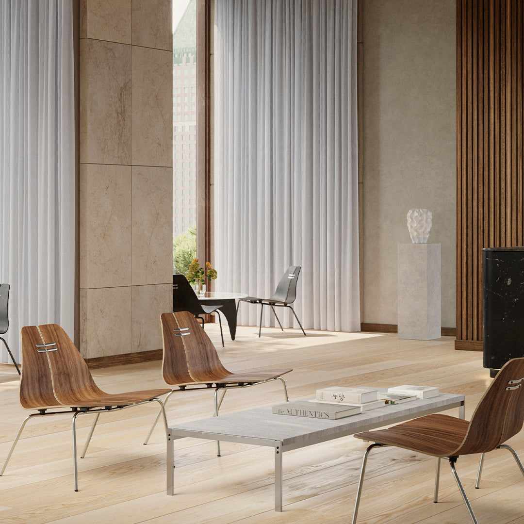 Originally designed as a conversational chair for lounge areas, it did not make it beyond sketches at the time. Kjærholm’s wife, Hanne Kjærholm, later approved a prototype of the PK23 for an exhibition at Louisiana Museum of Modern Art, and it will now come into production for the first time. The chair’s back and seat are crafted from laminated veneer shells, and the base is made of either stainless steel or black powder-coated steel. This work represents an intersection between the styles of PK4 and PK0, not yet as structural and minimalist as Kjærholm's later designs.