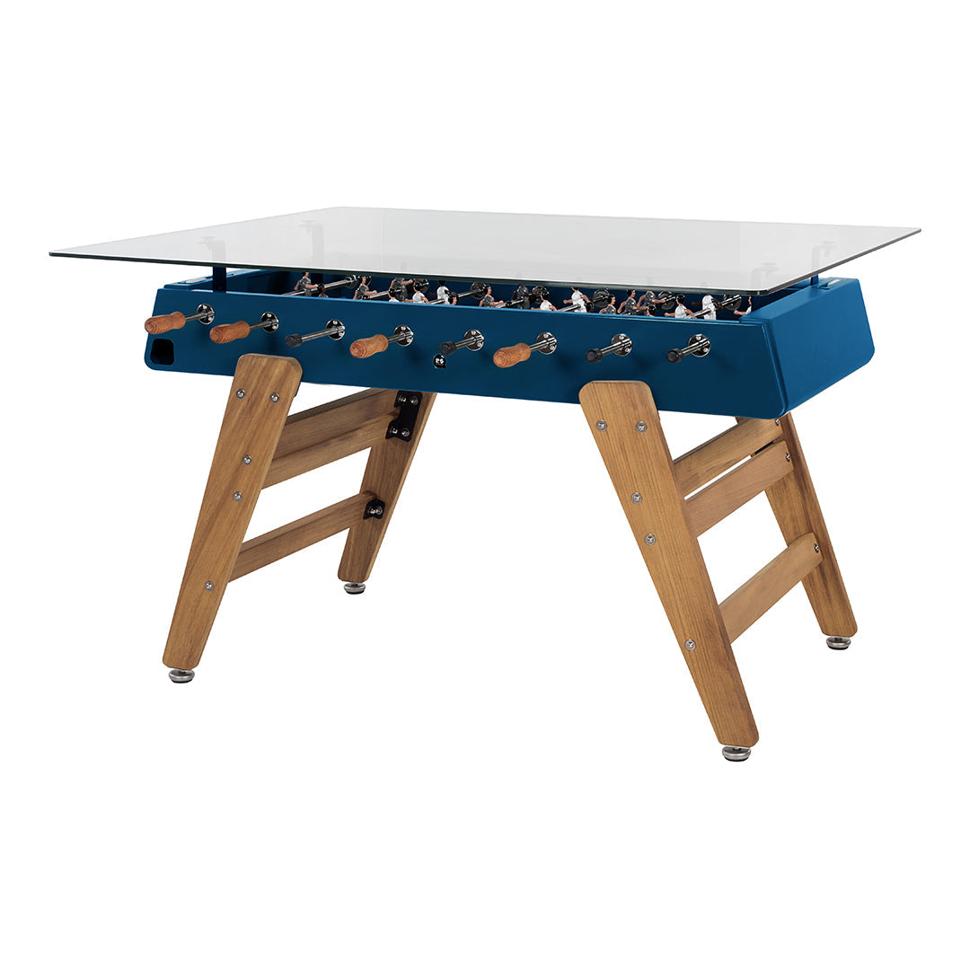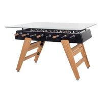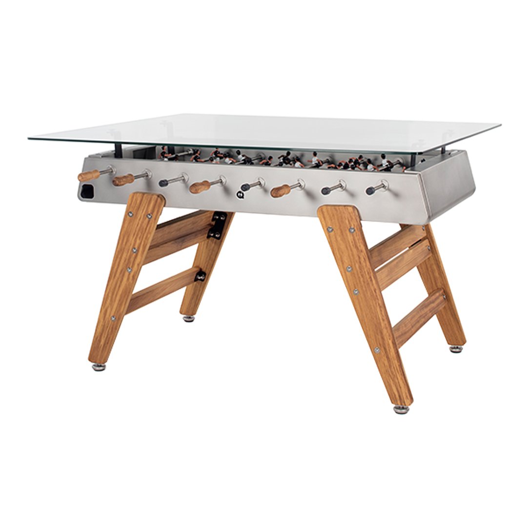 First came the RS2 Dining table. We turned our iconic RS2 football table into a dining table, which thanks to its fun, playful character became the special ingredient in many restaurants. It was only natural that the RS3 Wood Dining table would have its moment. This is the dining table version of our RS3 Wood. Without altering its essence and playful spirit, We've added functionality to this model. Now it's not just a football table; it's a football-dining table with a glass top. To play between dishes, or to eat between scoring goals.