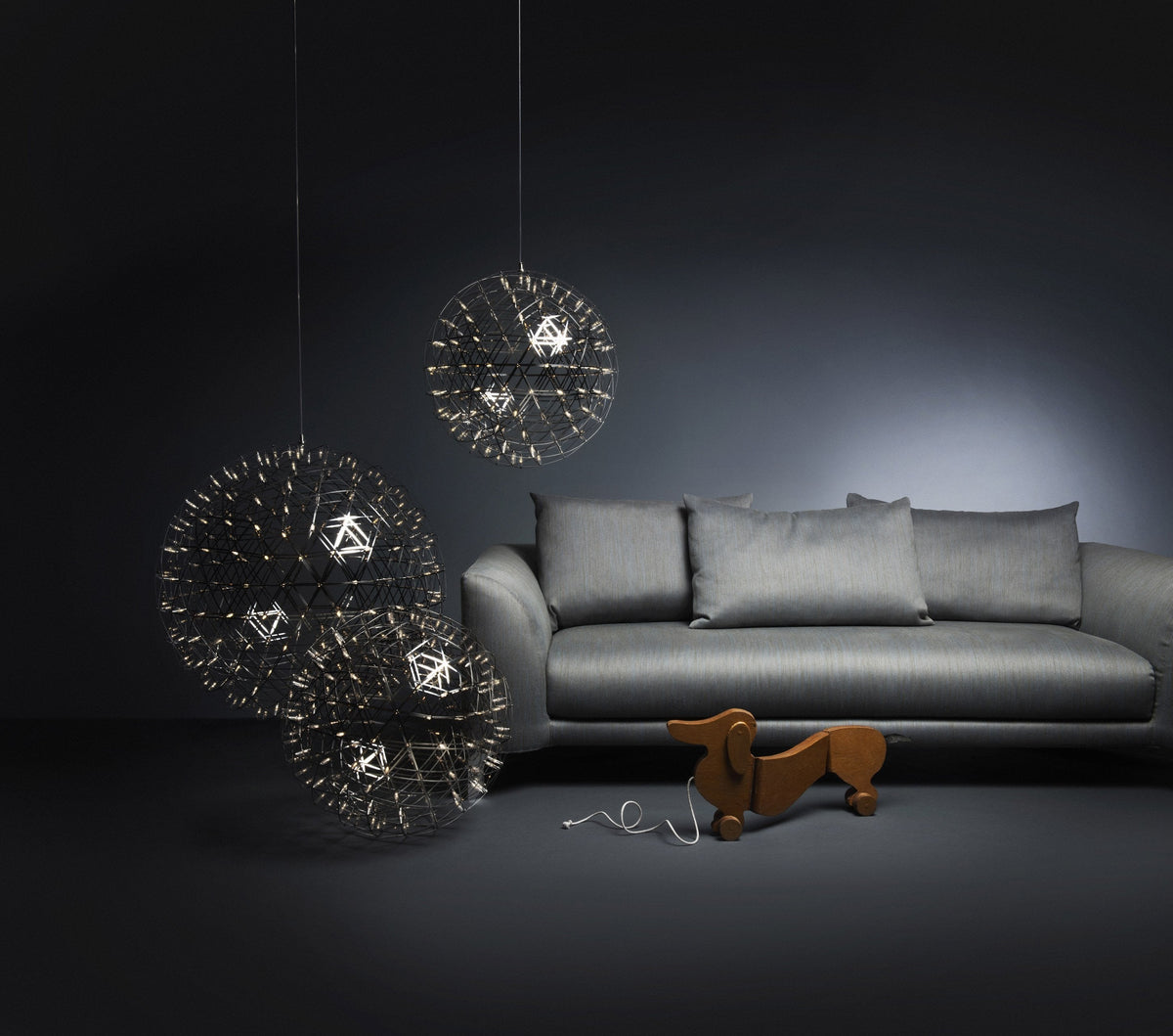 The intricate spheres of Raimond transport the electrical current. The LED terminals then join these paths to create an atmospheric ambiance. The transparent lenses are specially detailed to spread warm white light in every direction.